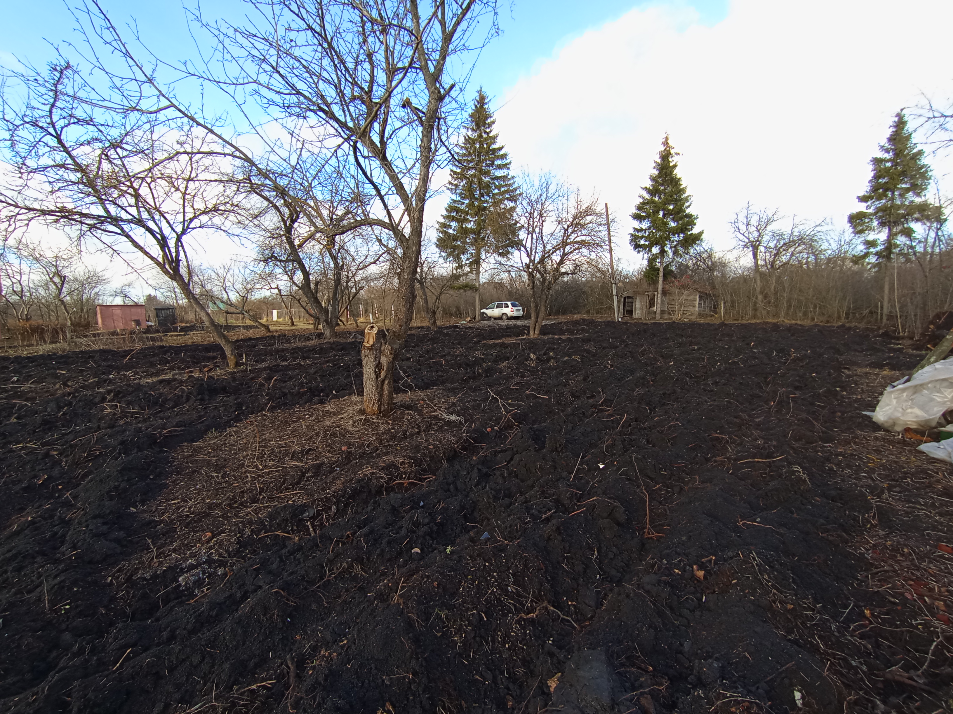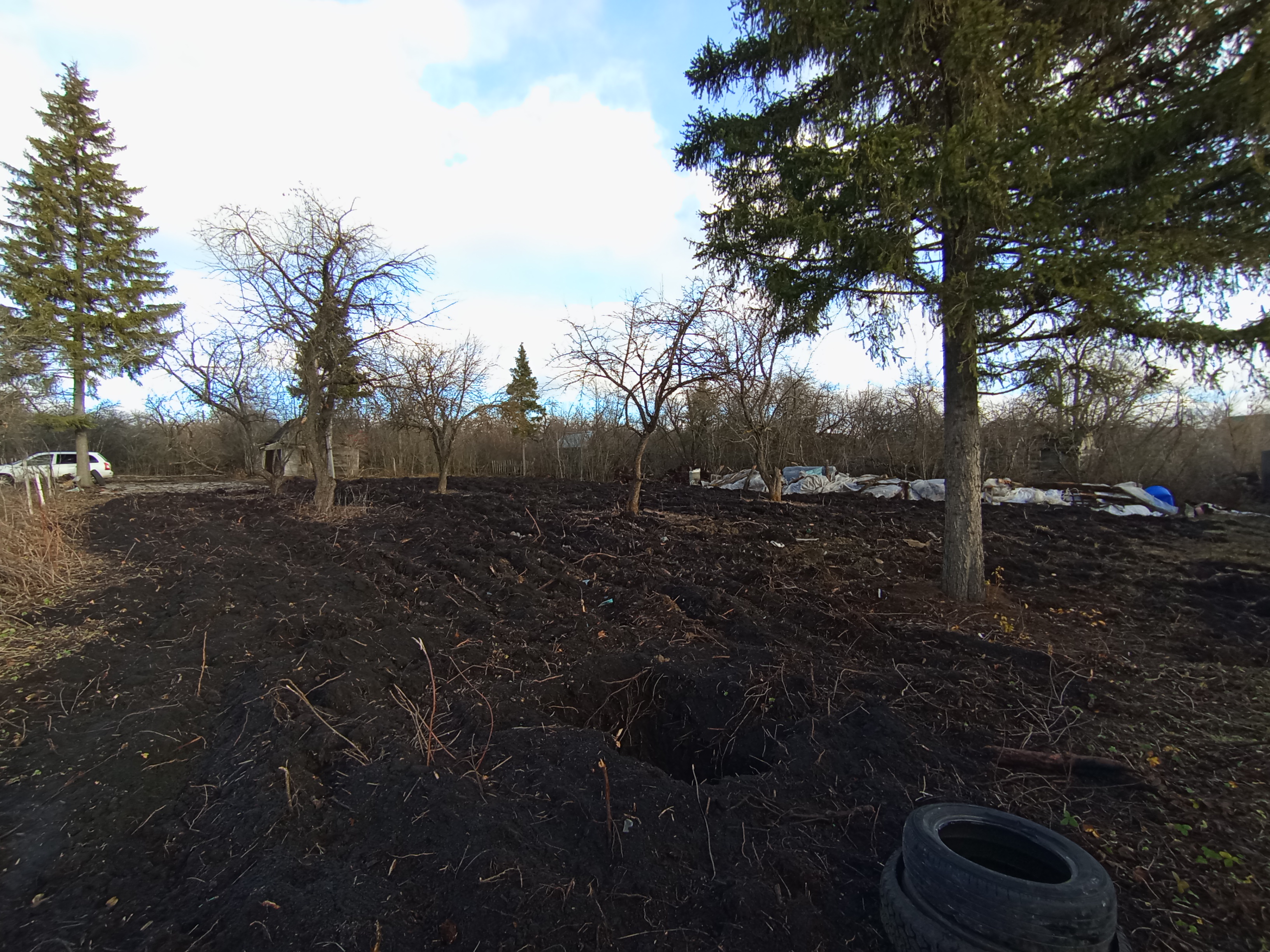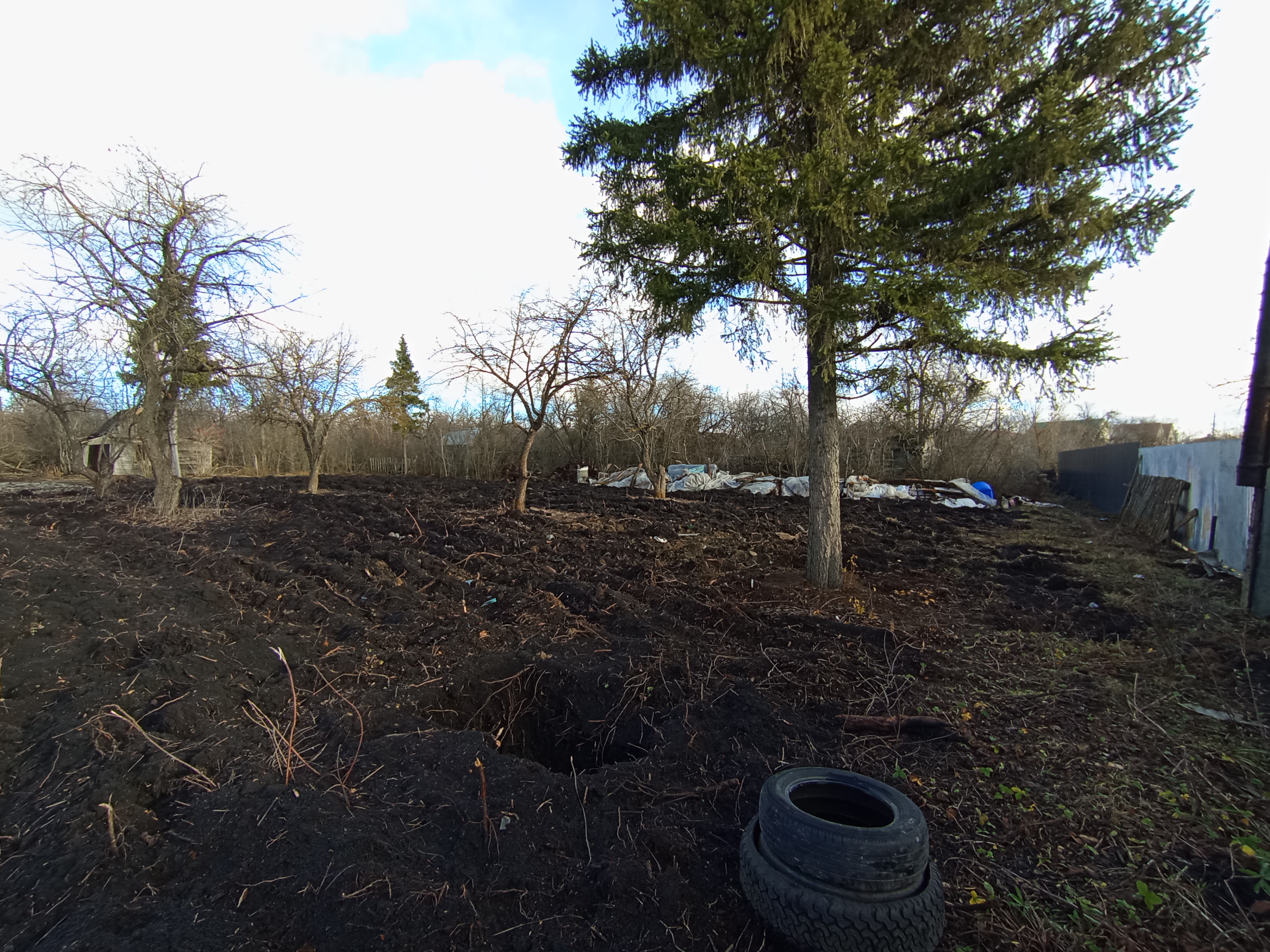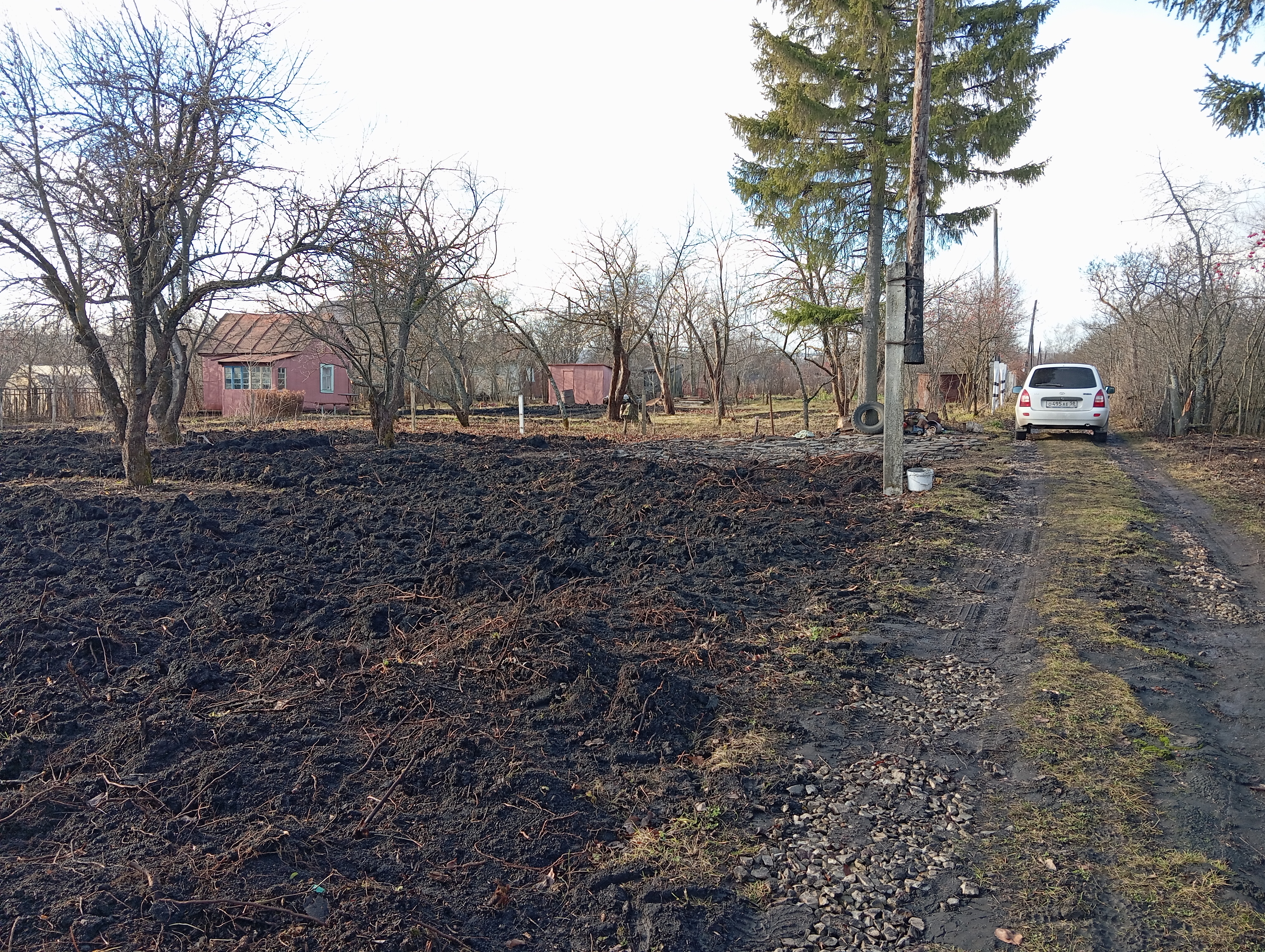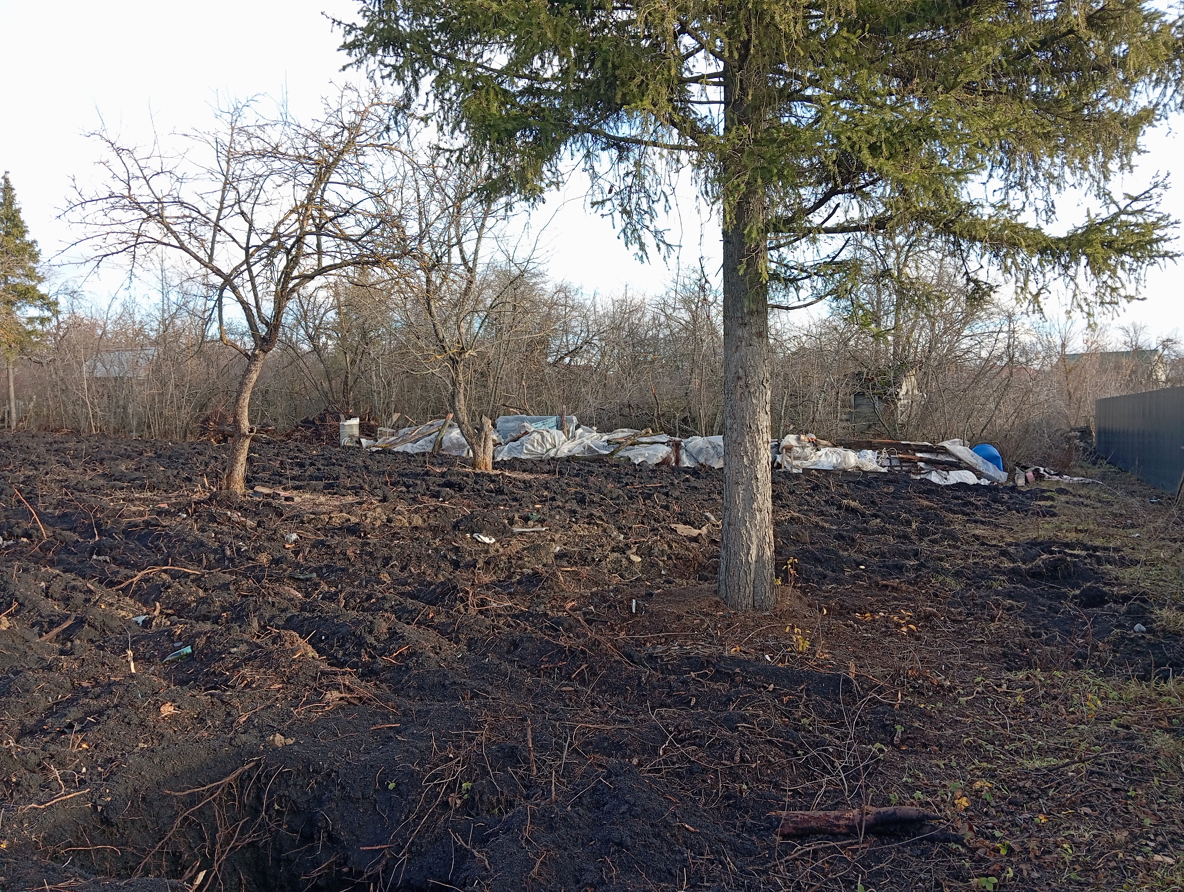 Домик был 15 кв.м. (разобрали под сарай). Дачный участок не использовался лет 10, в этом году выкорчевали корни и вспахали. Отсыпано парковочое место, выкопана яма для туалета.
