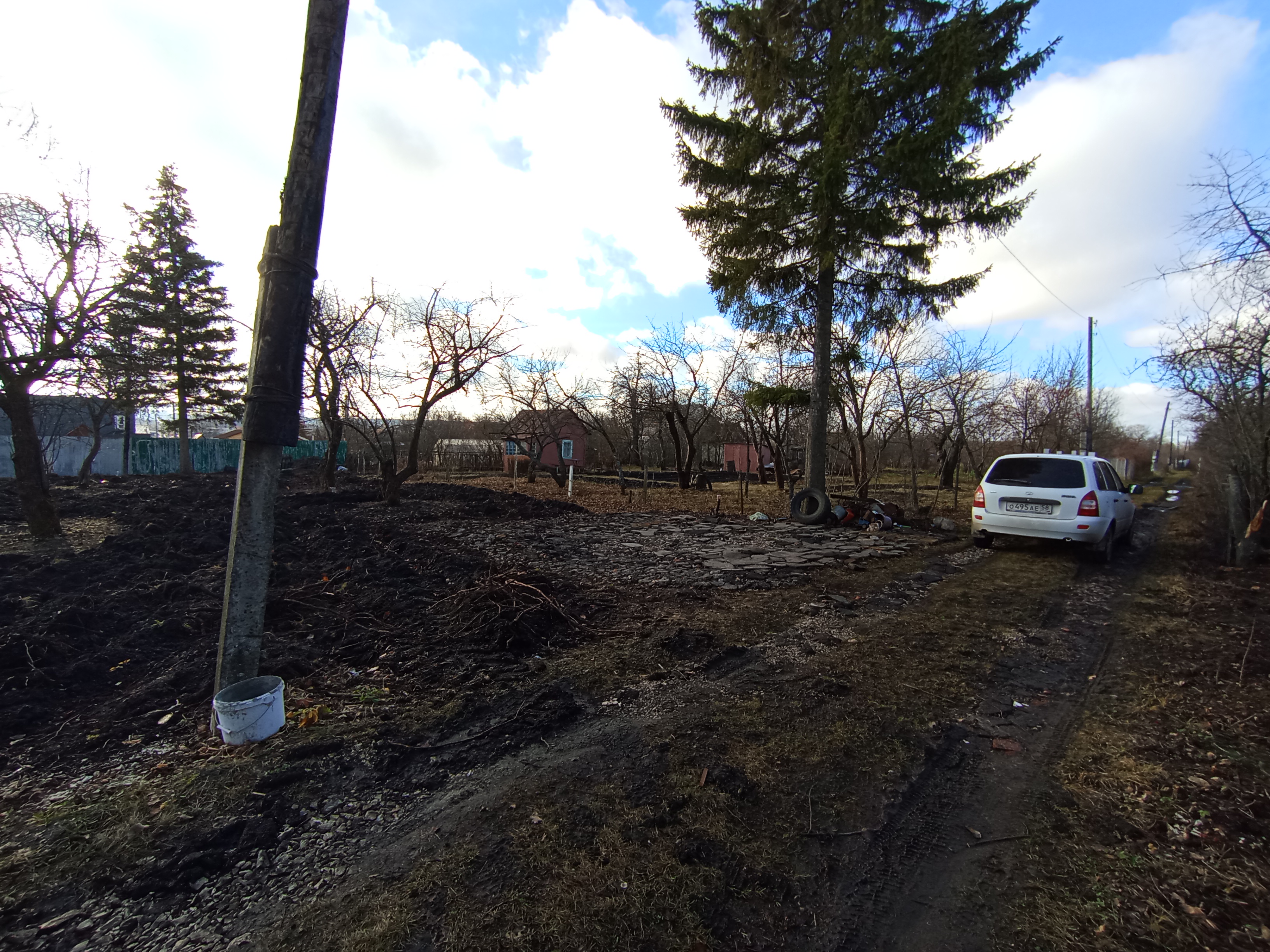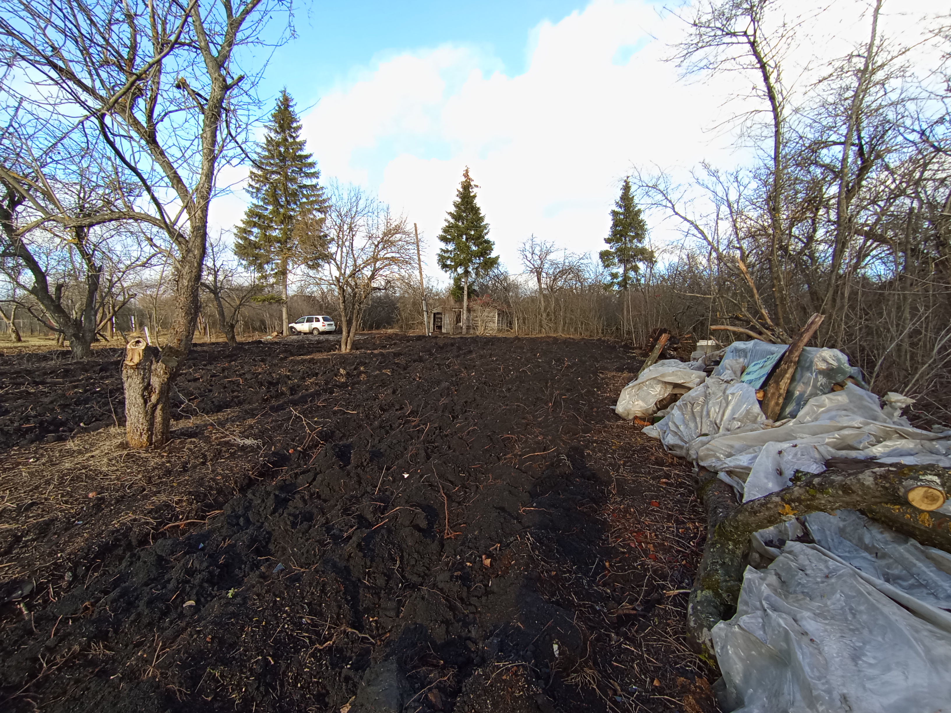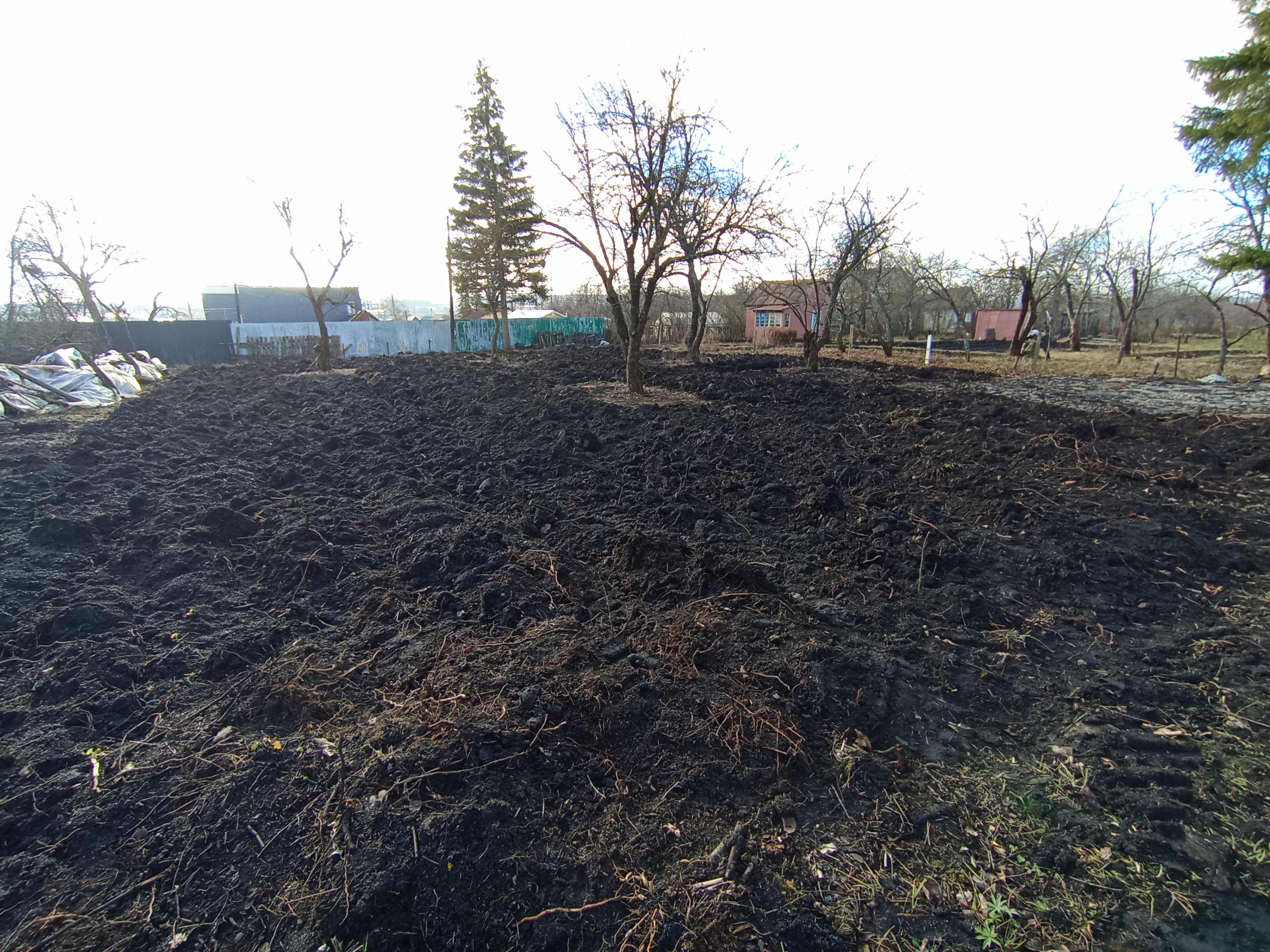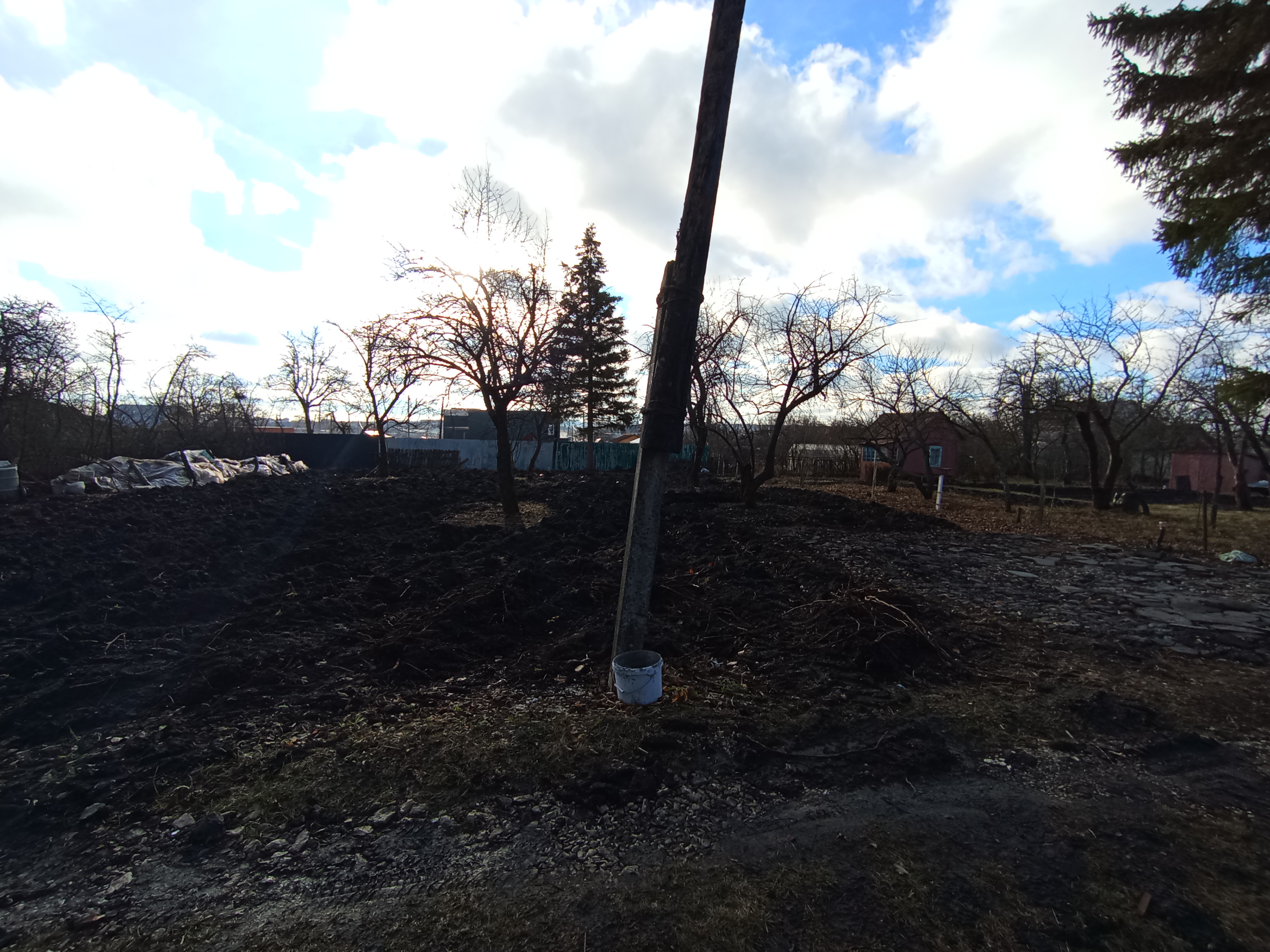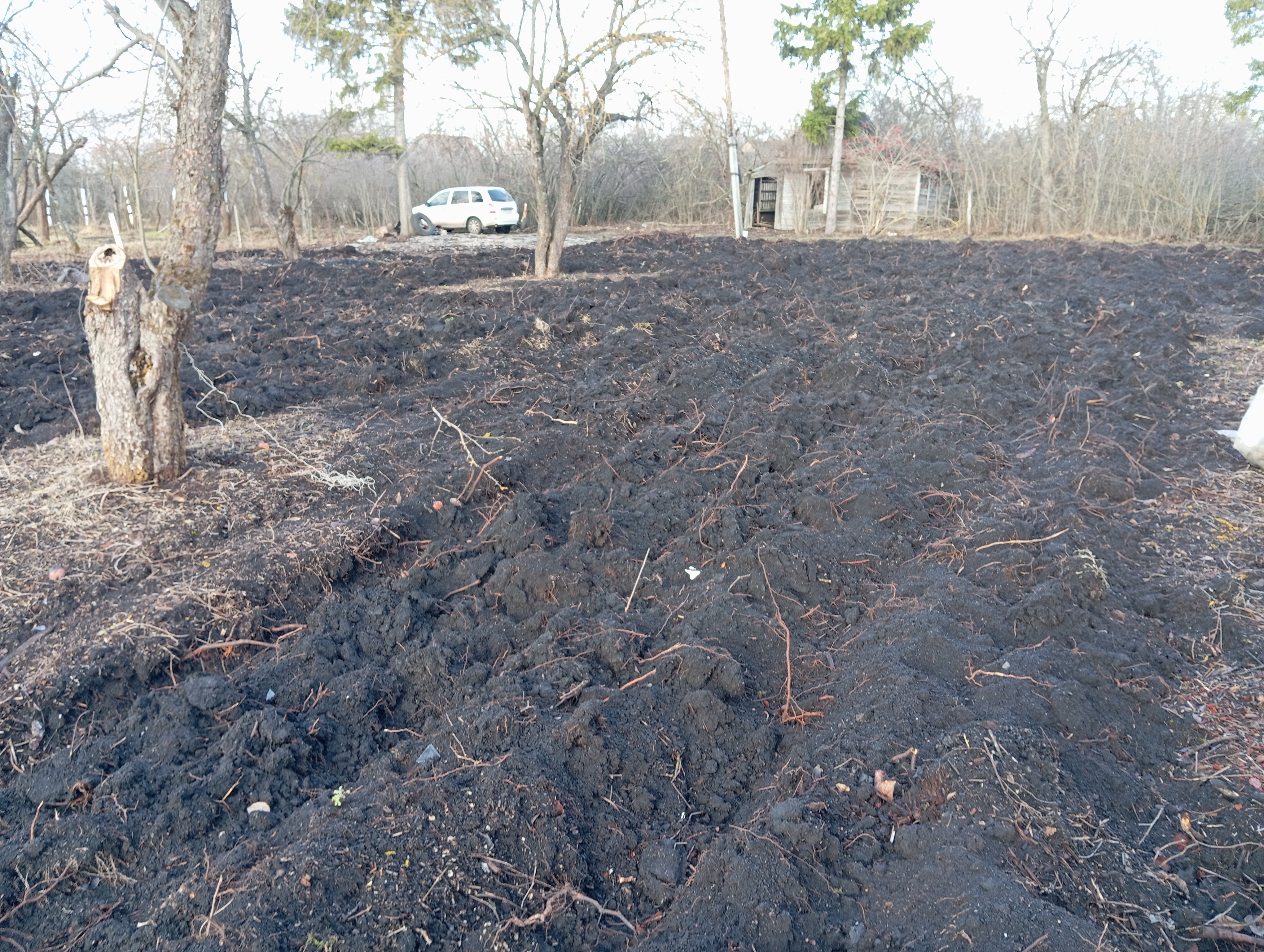 Домик был 15 кв.м. (разобрали под сарай). Дачный участок не использовался лет 10, в этом году выкорчевали корни и вспахали. Отсыпано парковочое место, выкопана яма для туалета.