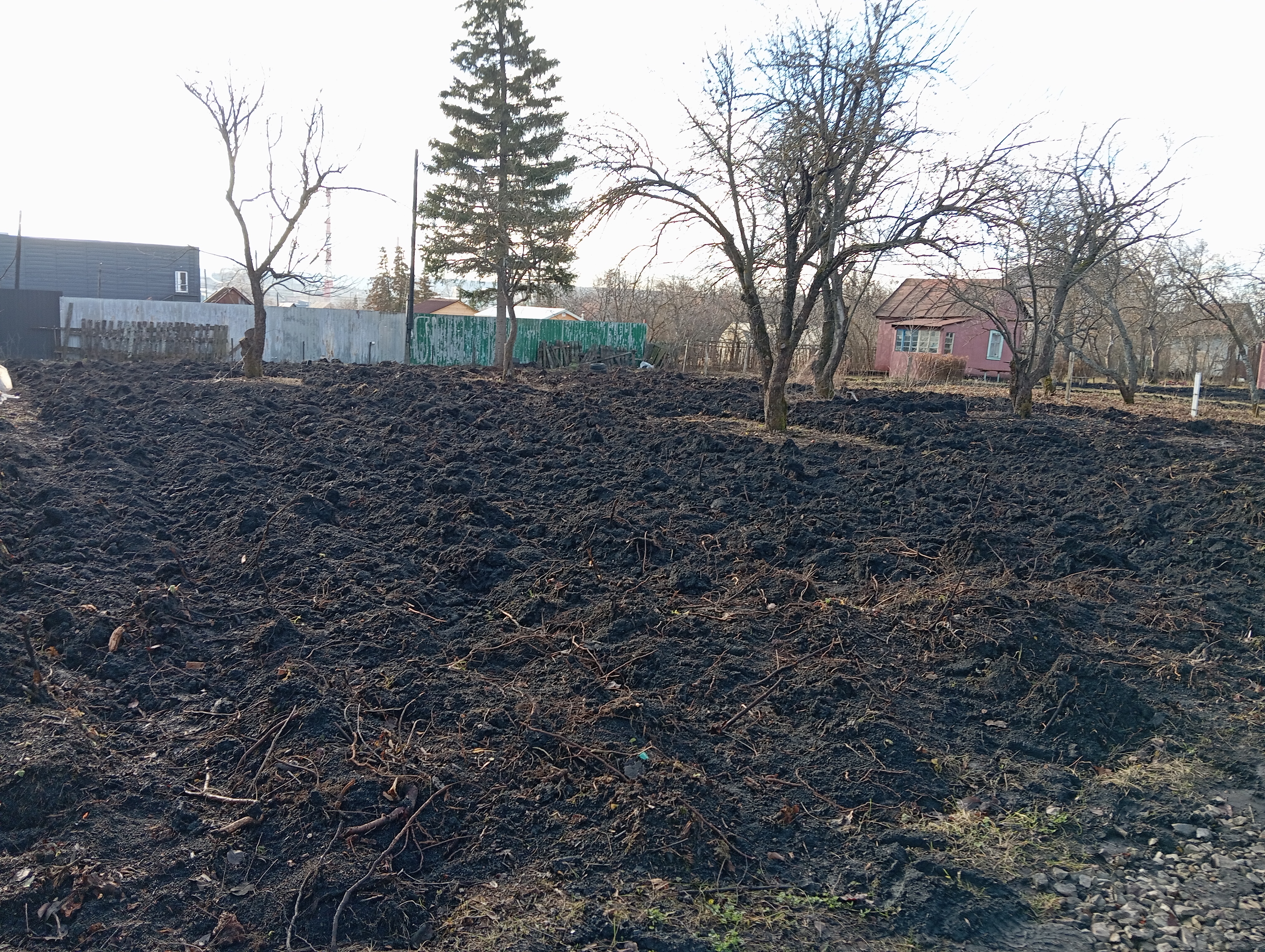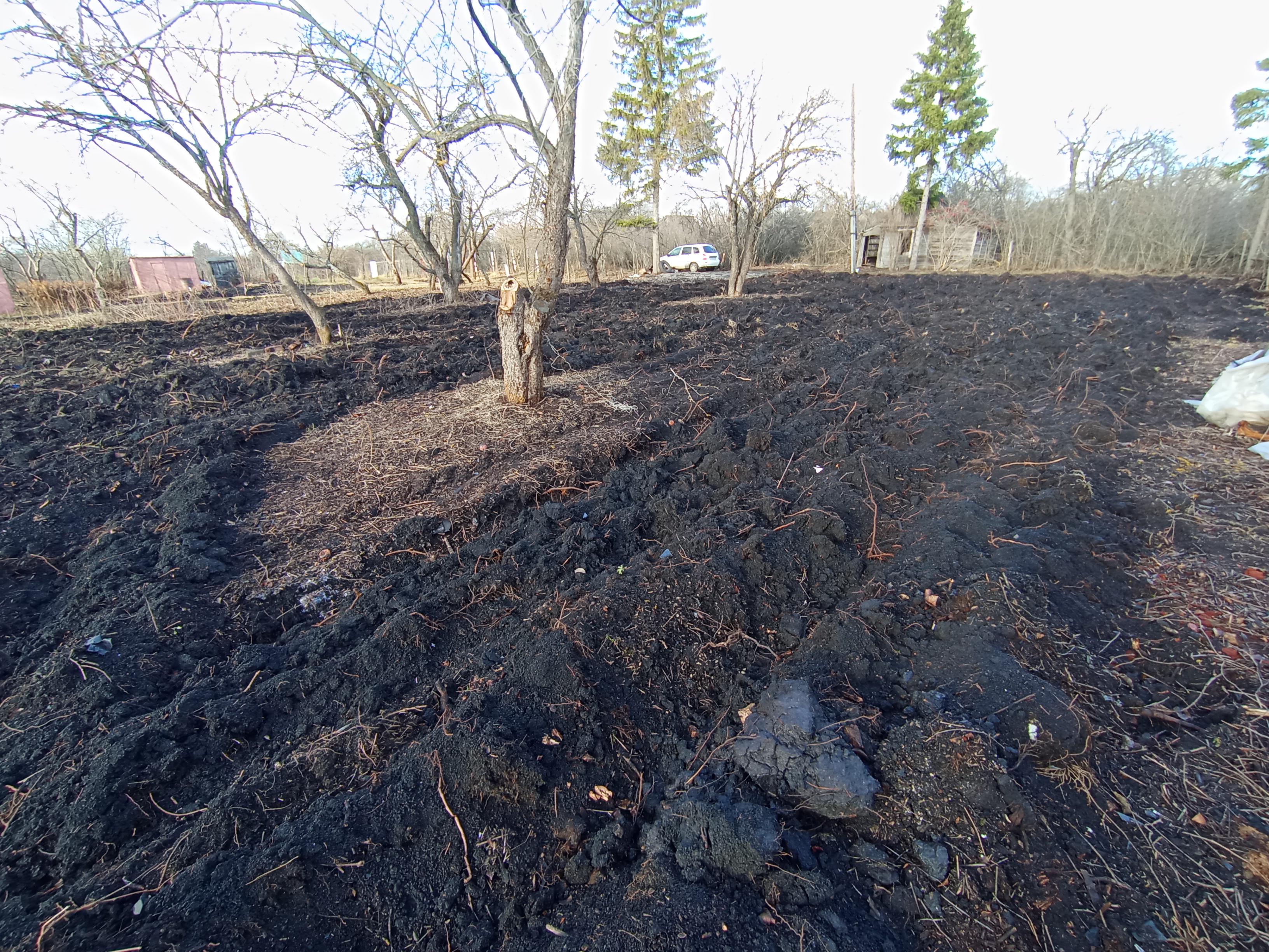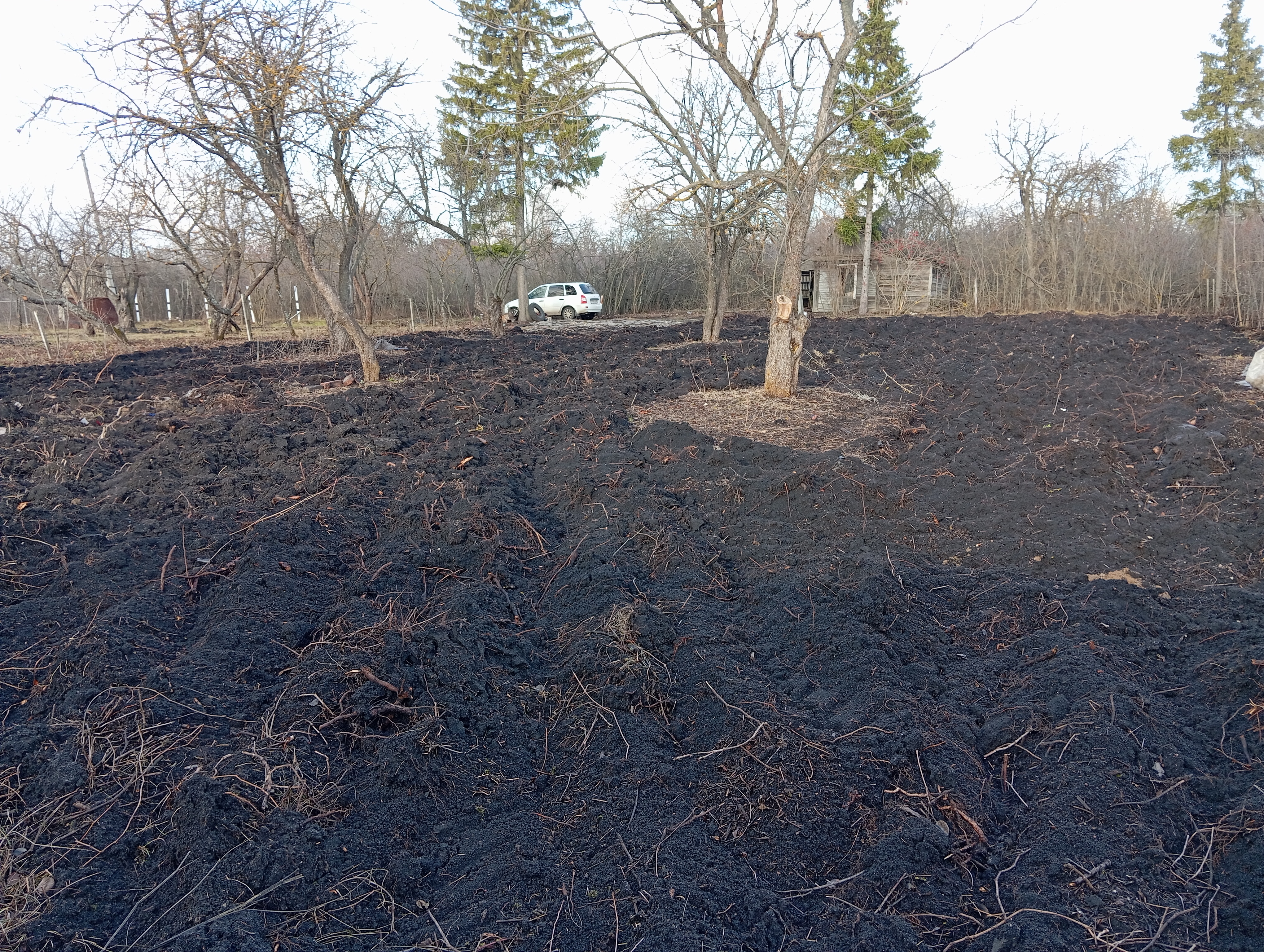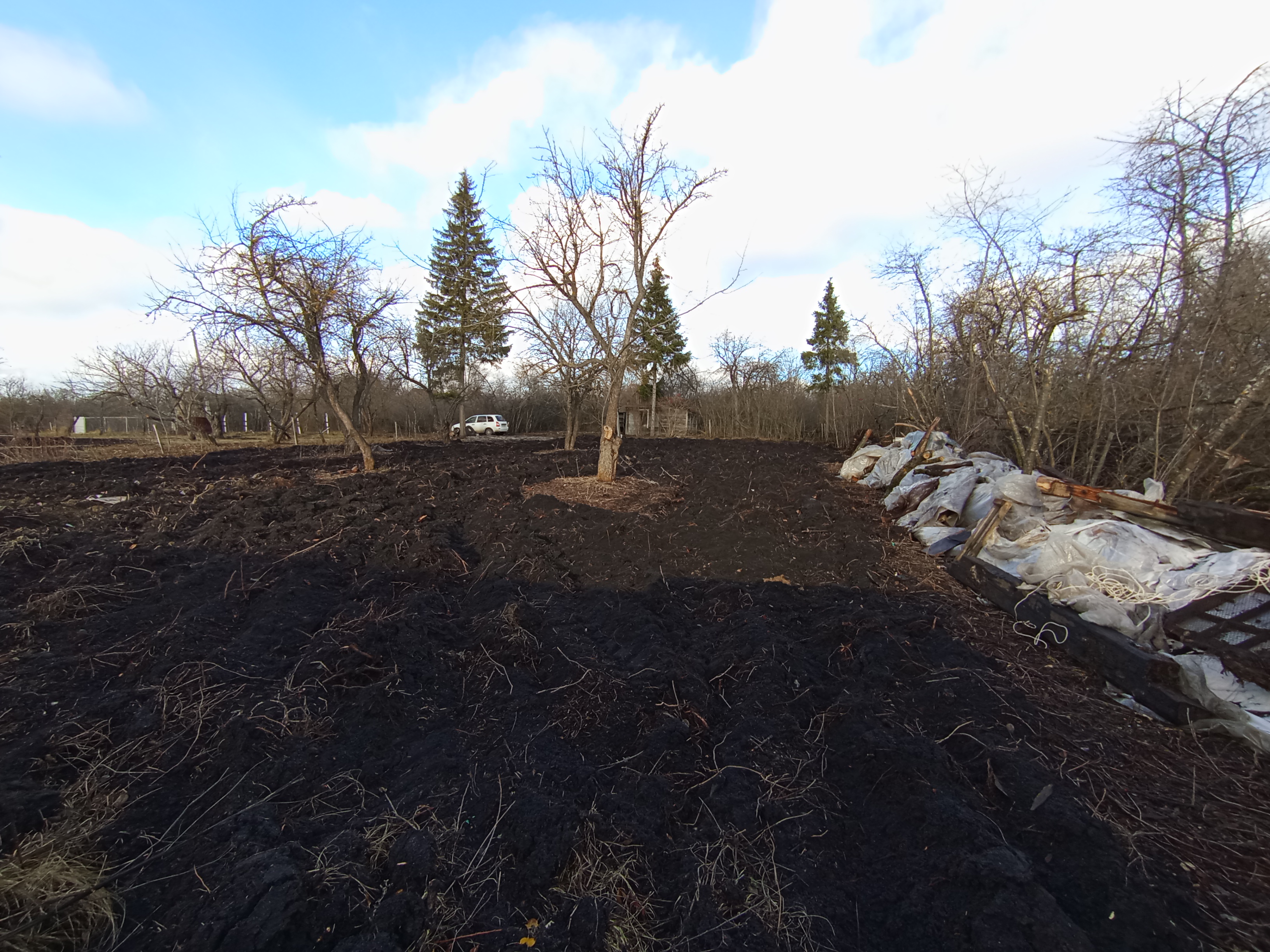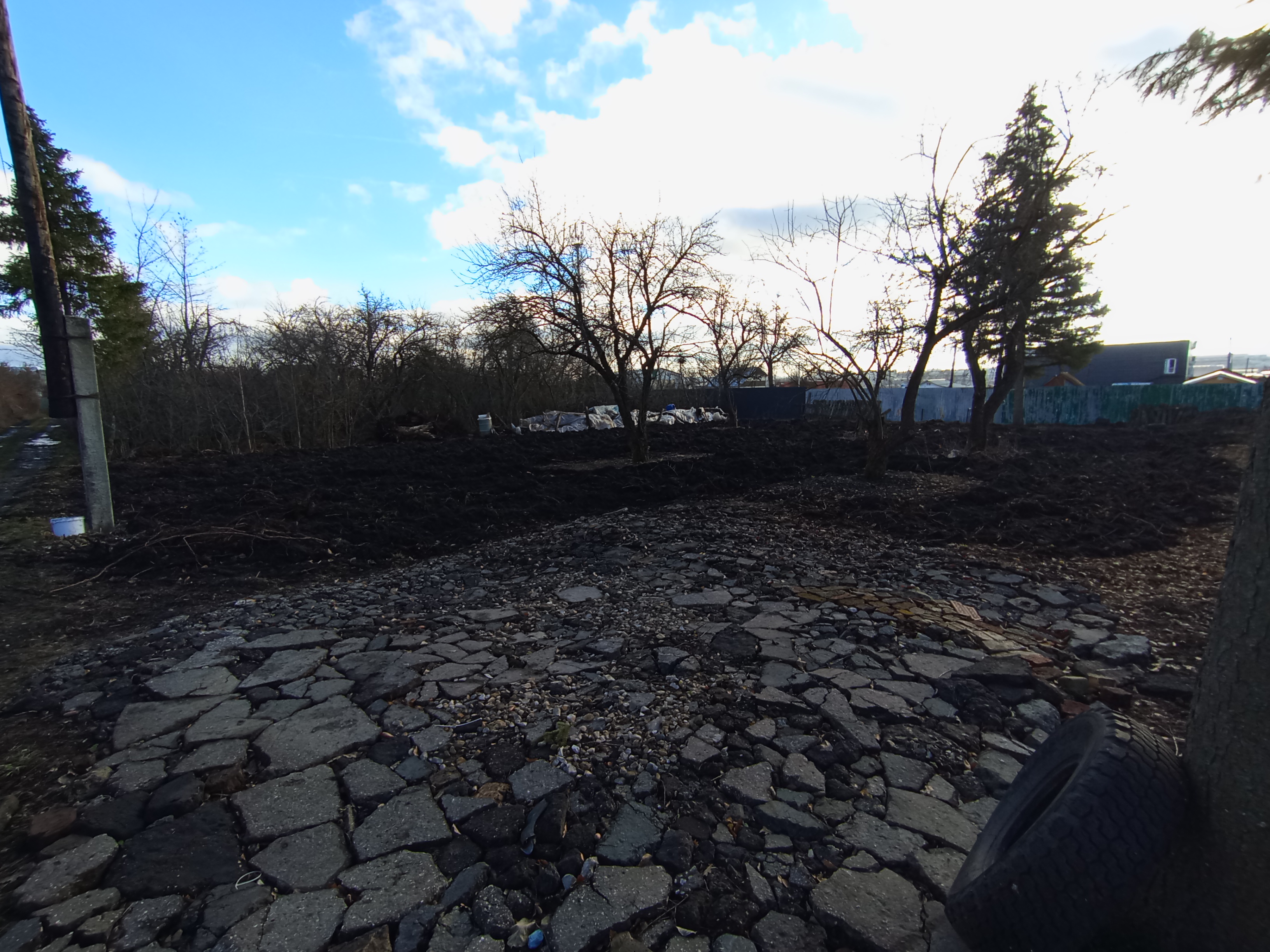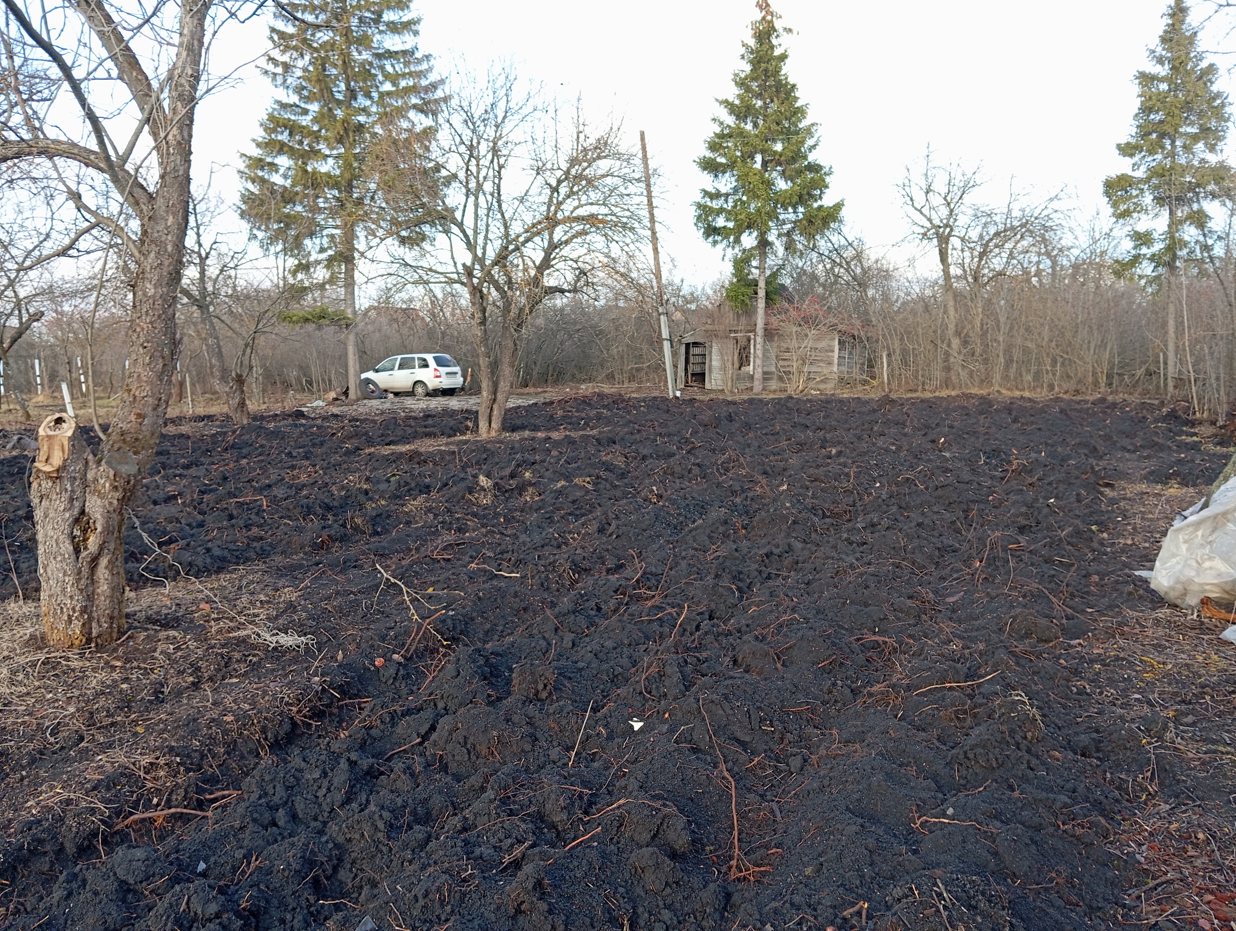 Домик был 15 кв.м. (разобрали под сарай). Дачный участок не использовался лет 10, в этом году выкорчевали корни и вспахали. Отсыпано парковочое место, выкопана яма для туалета.
