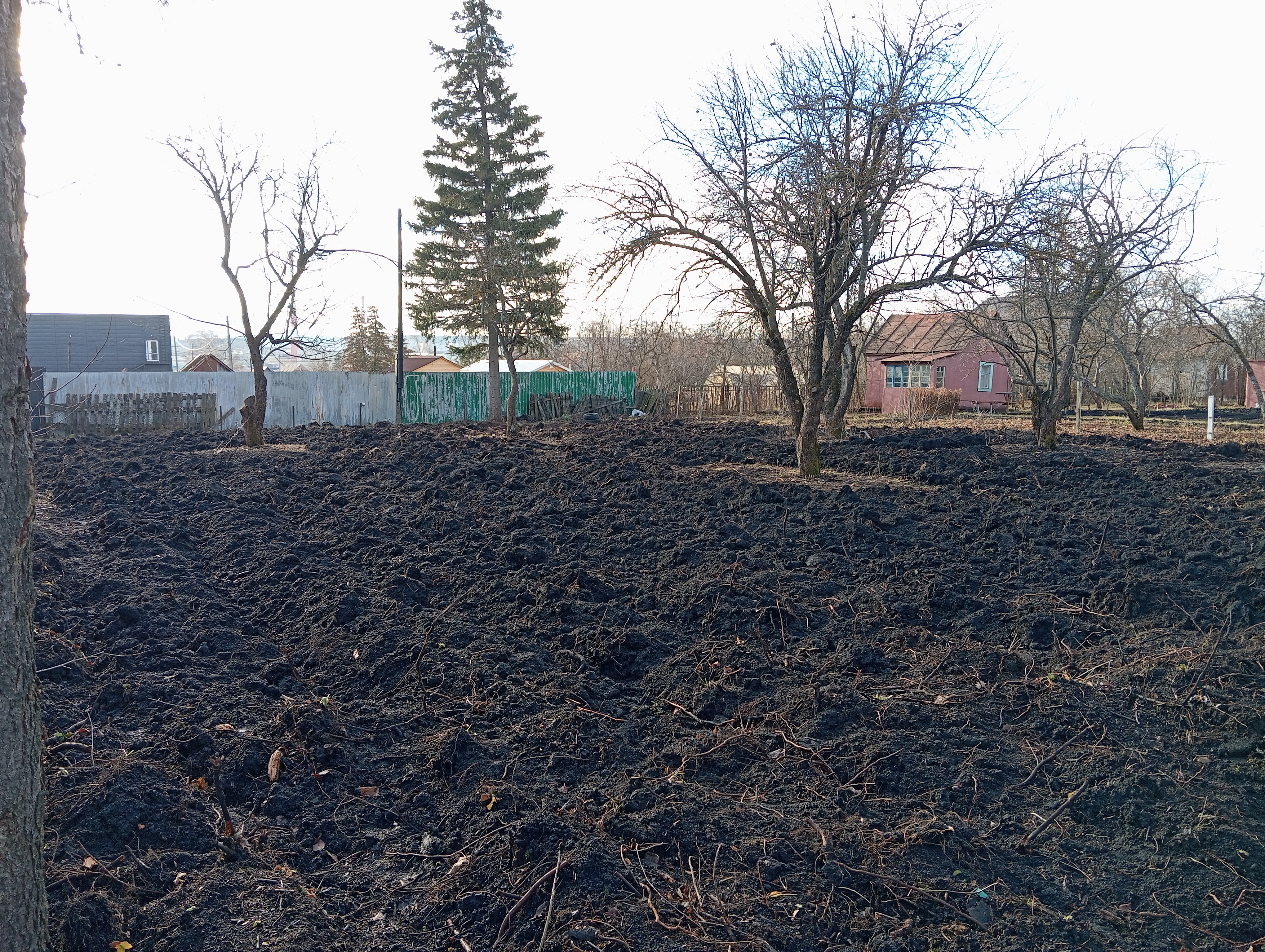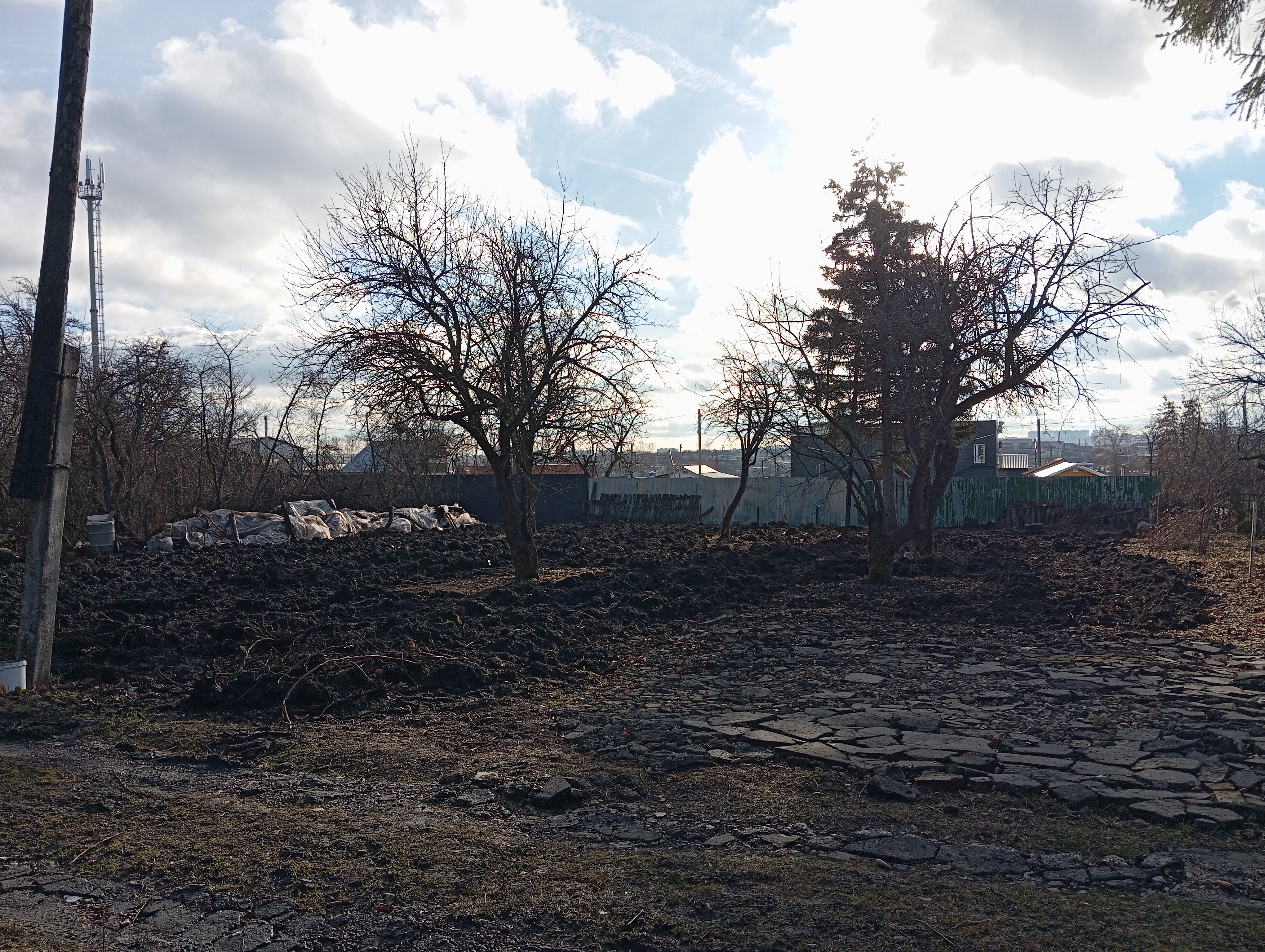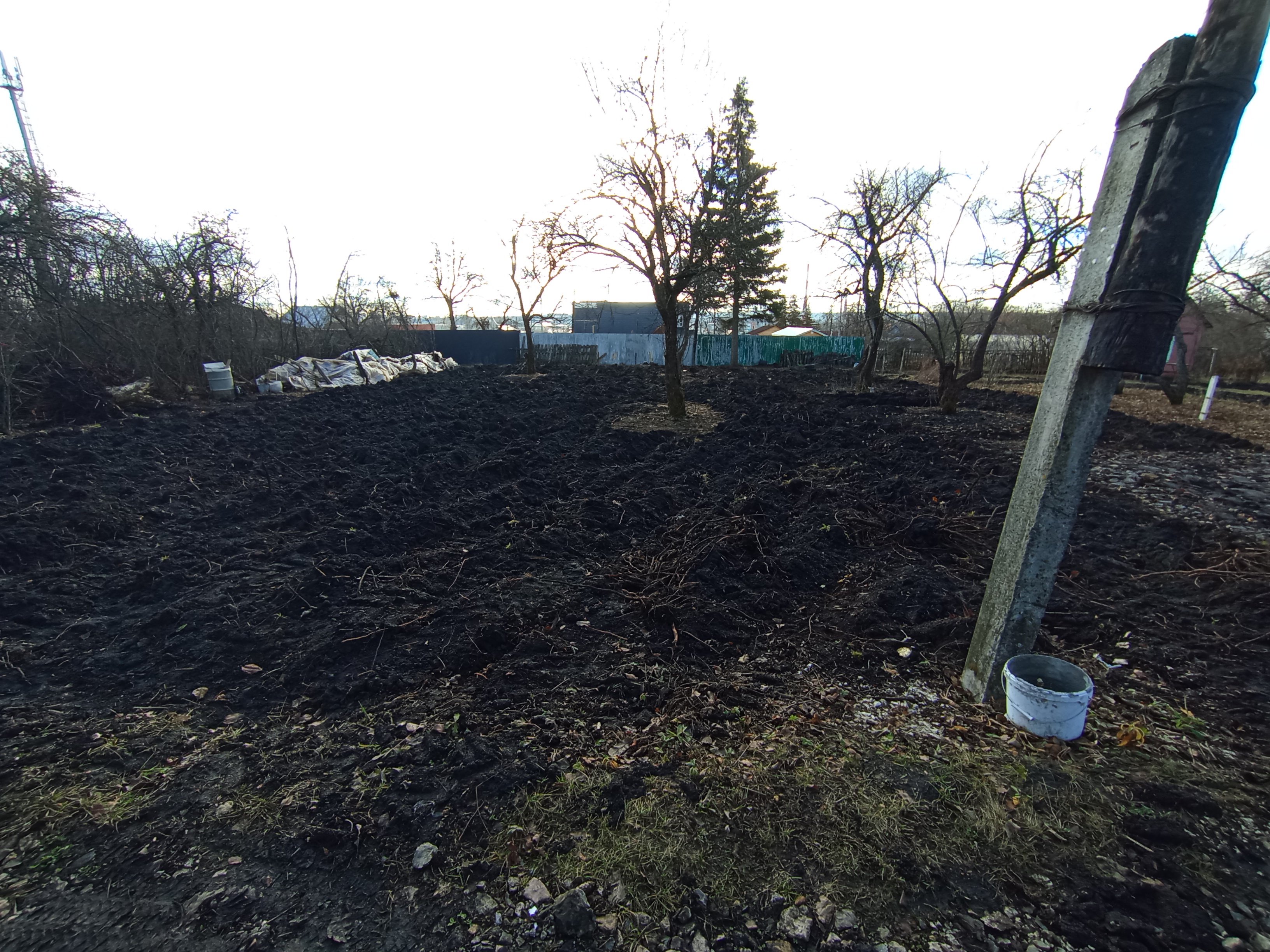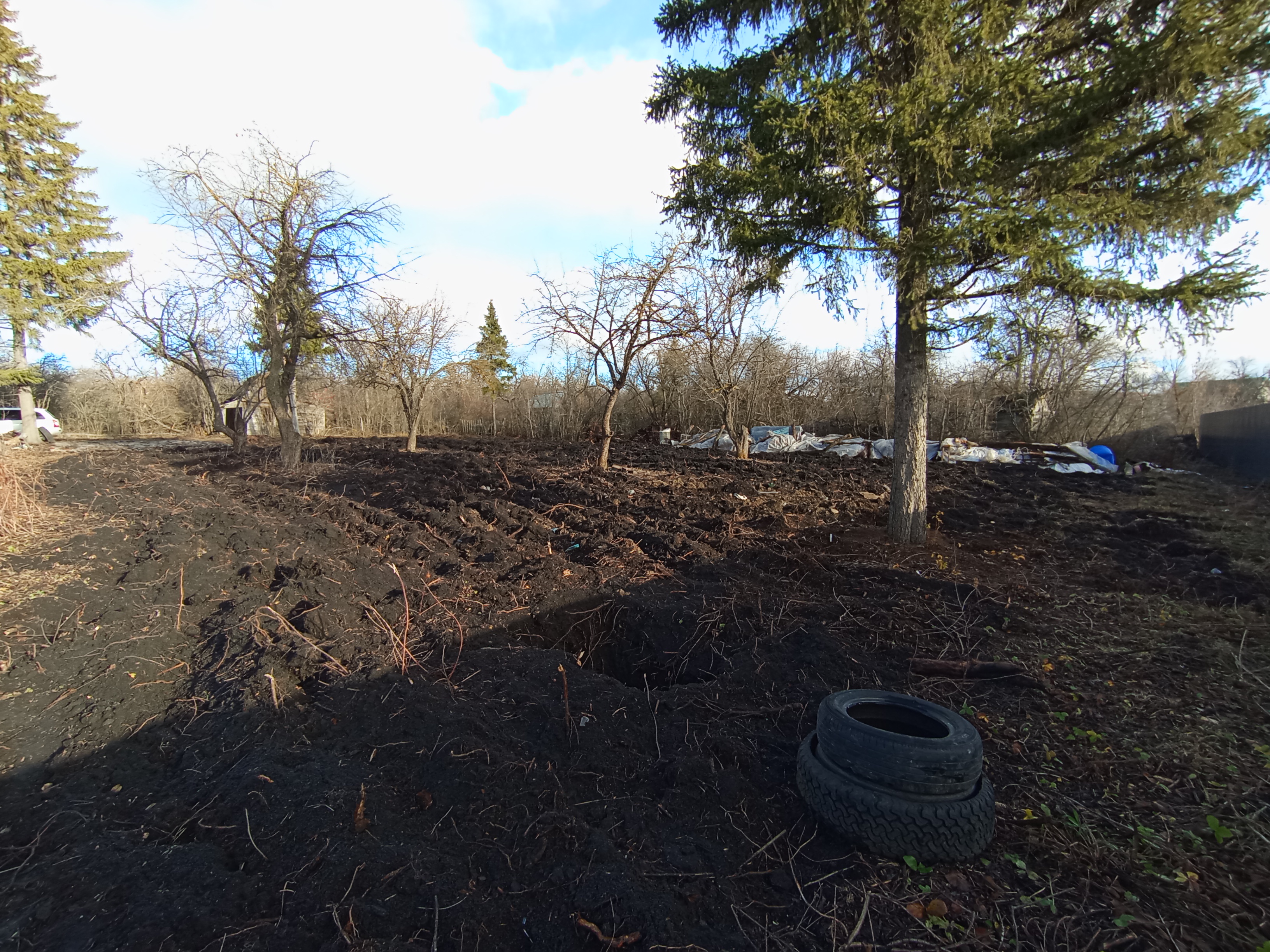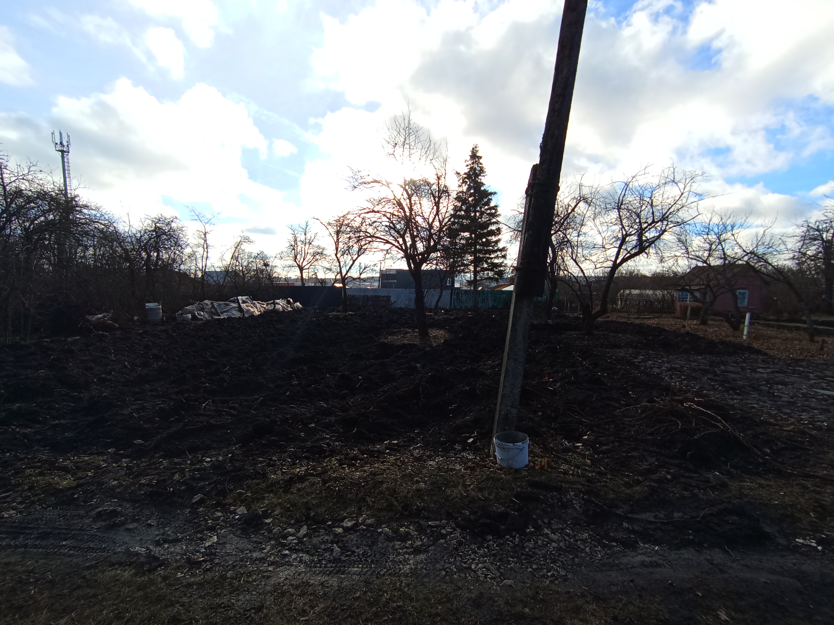 Домик был 15 кв.м. (разобрали под сарай). Дачный участок не использовался лет 10, в этом году выкорчевали корни и вспахали. Отсыпано парковочое место, выкопана яма для туалета.