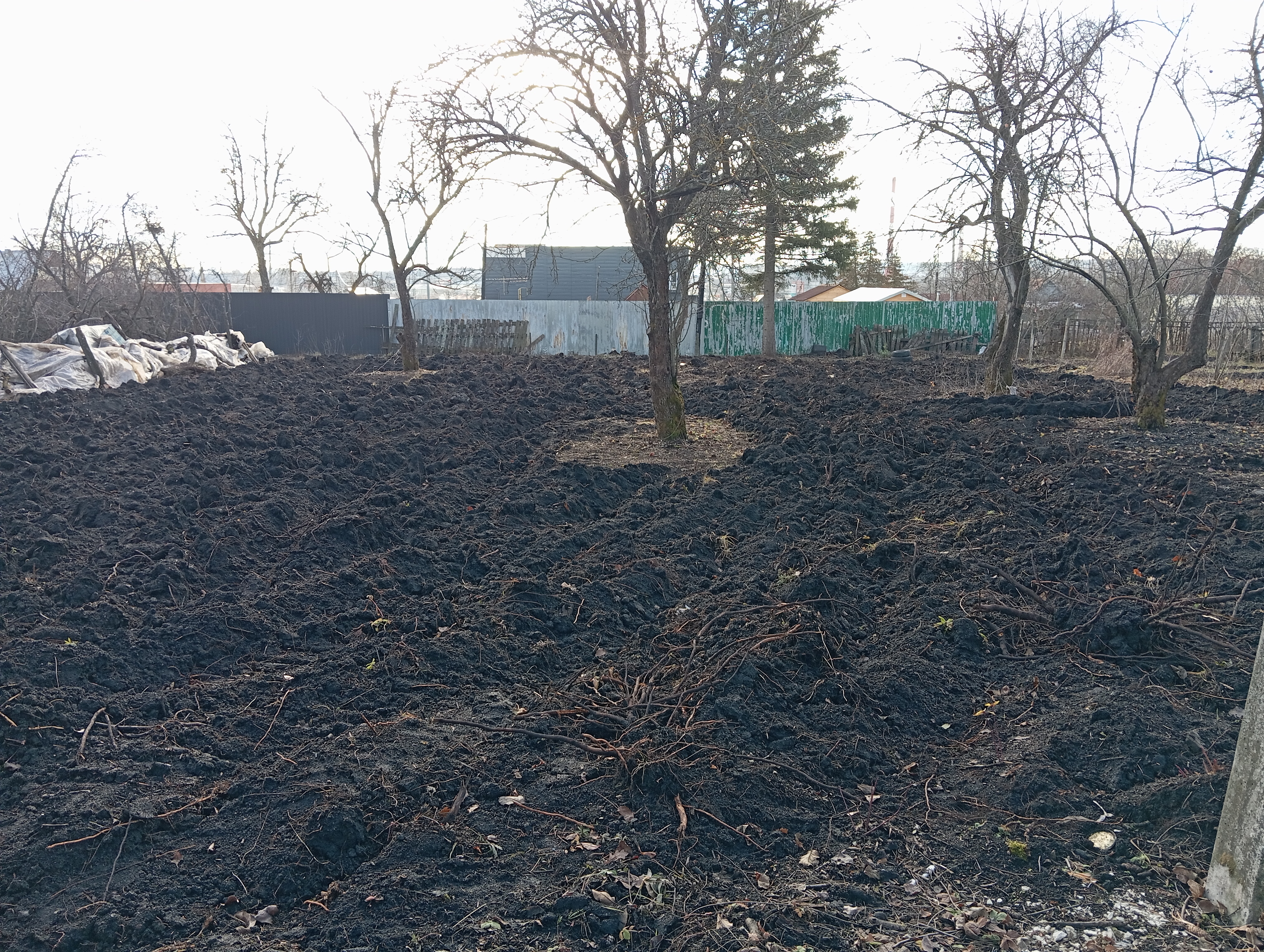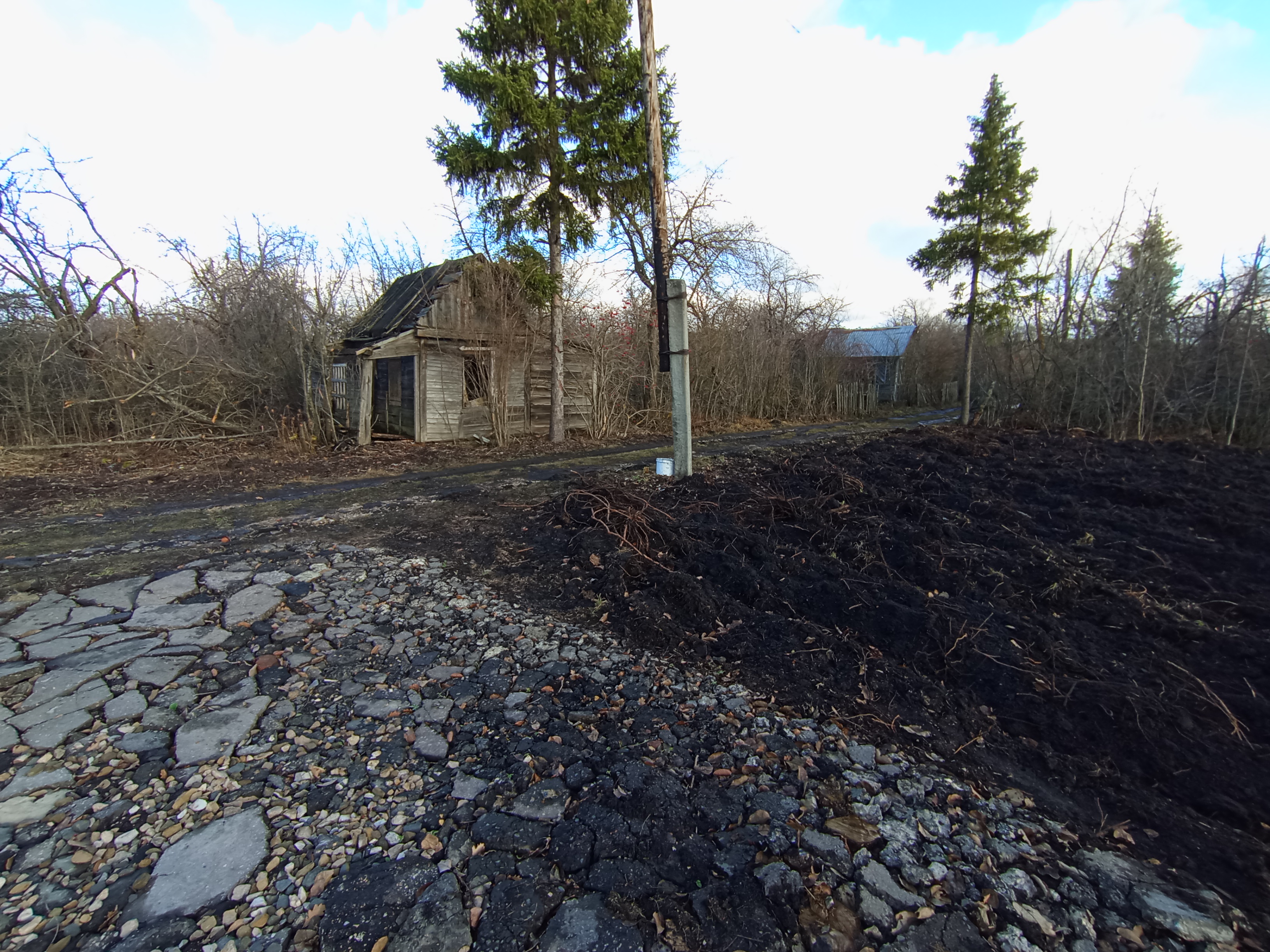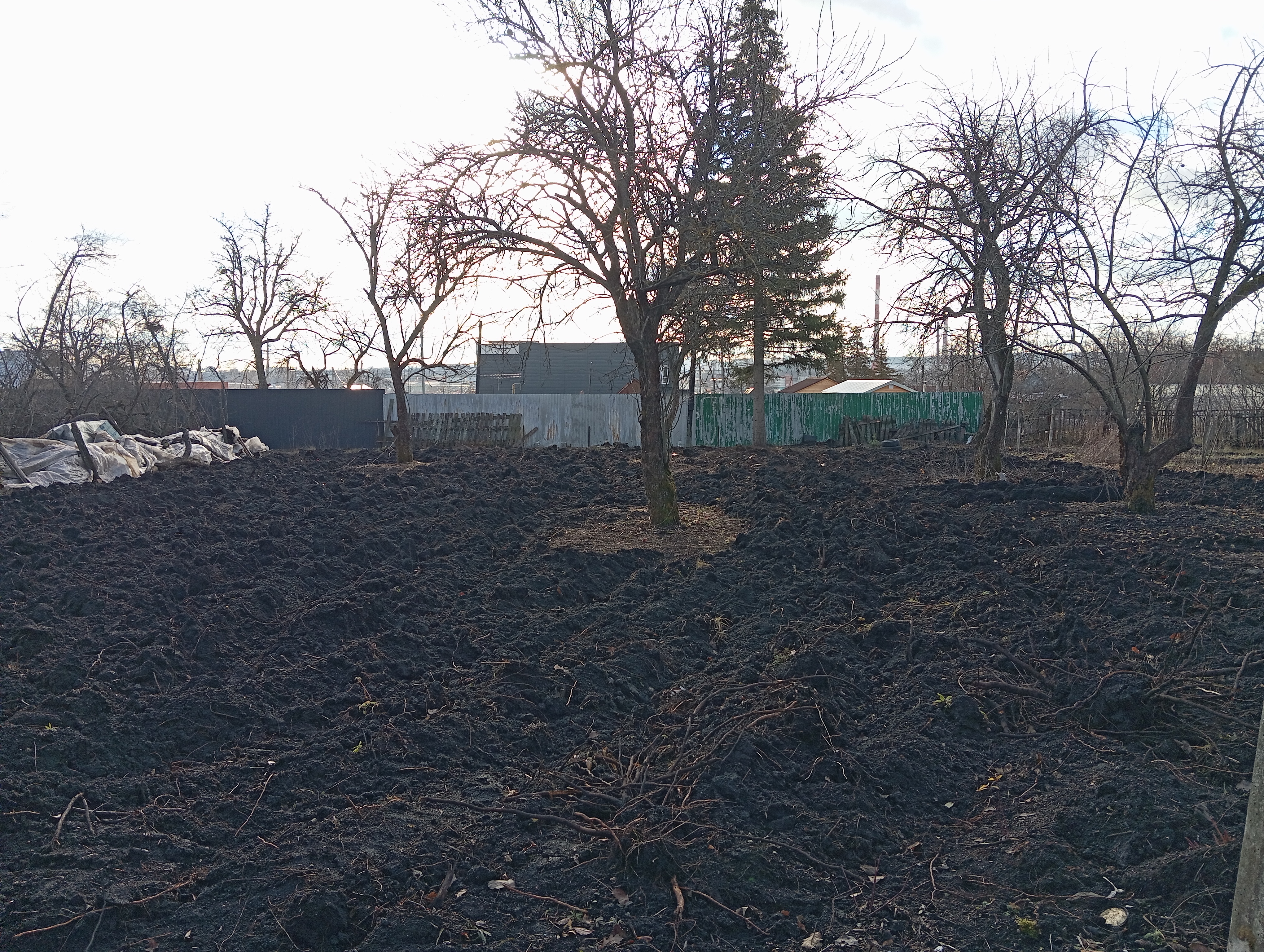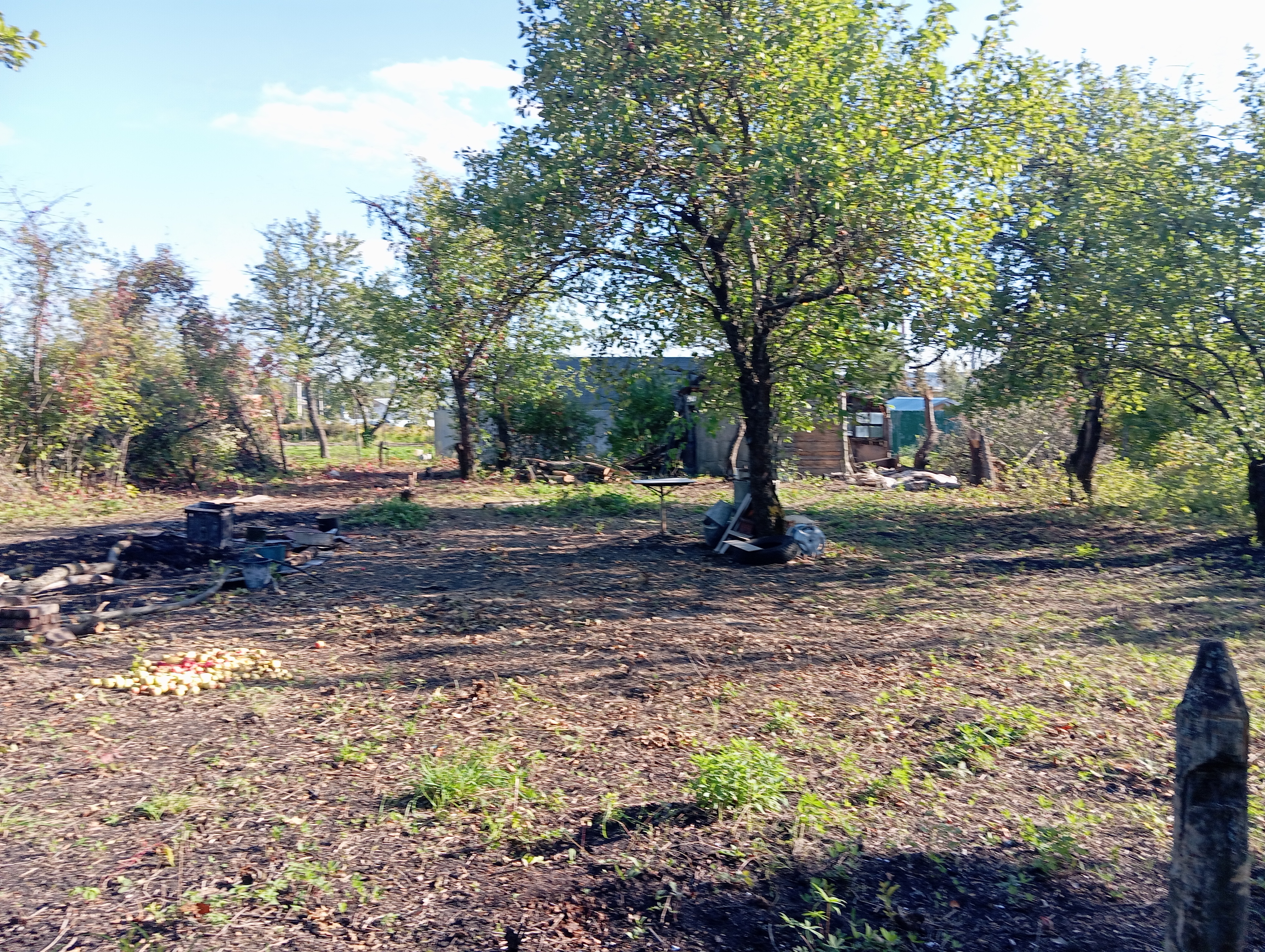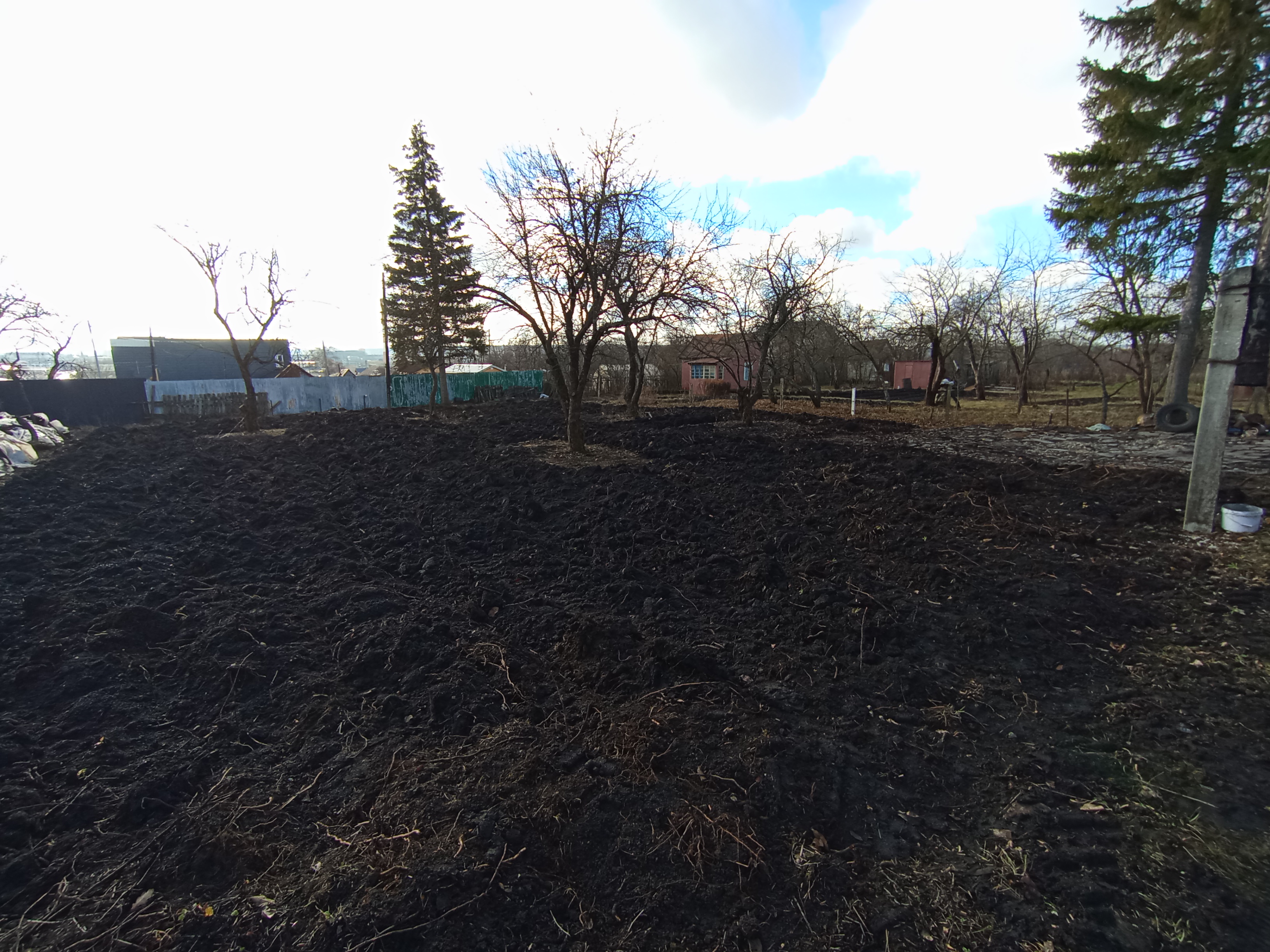 Домик был 15 кв.м. (разобрали под сарай). Дачный участок не использовался лет 10, в этом году выкорчевали корни и вспахали. Отсыпано парковочое место, выкопана яма для туалета.
