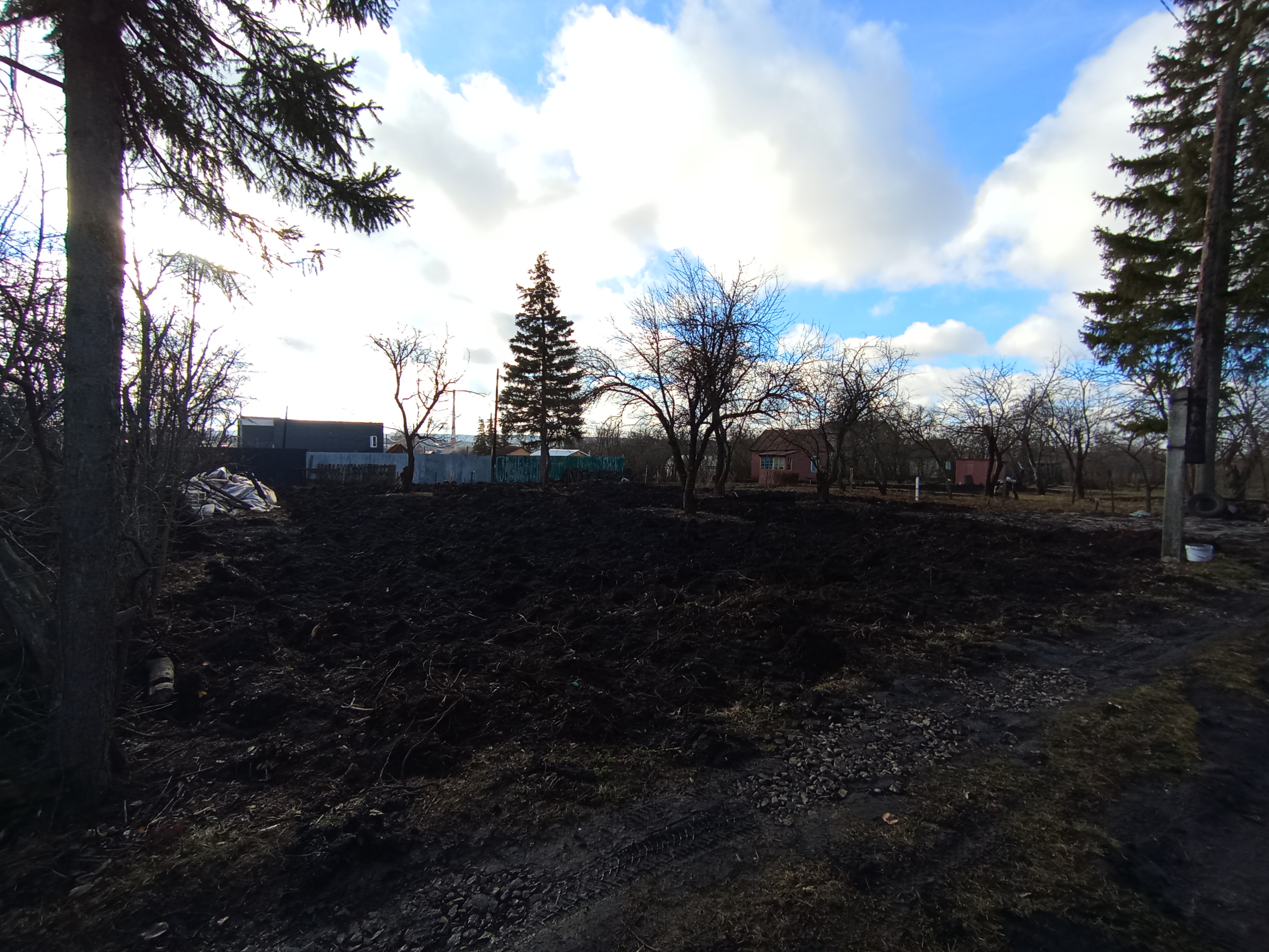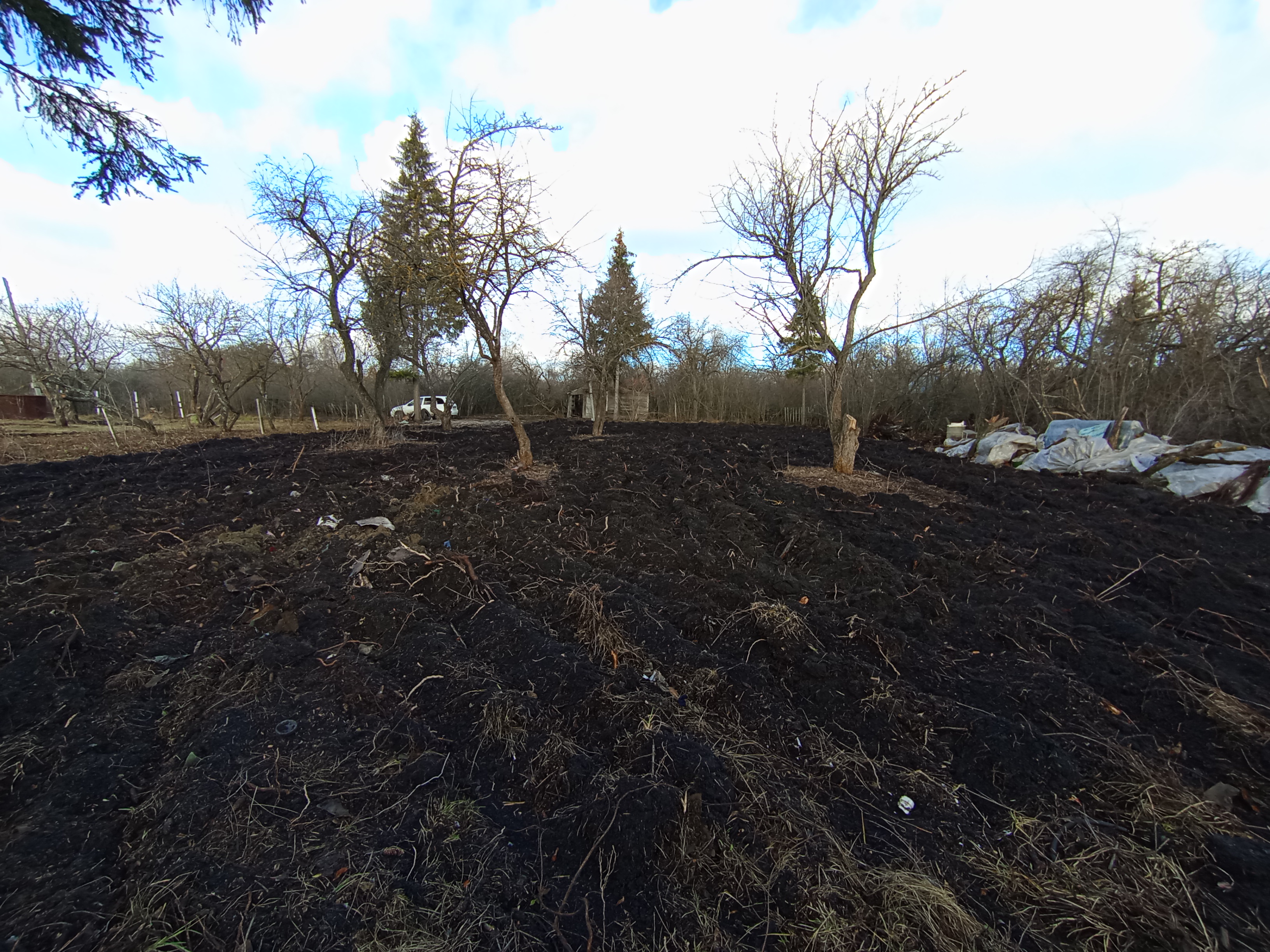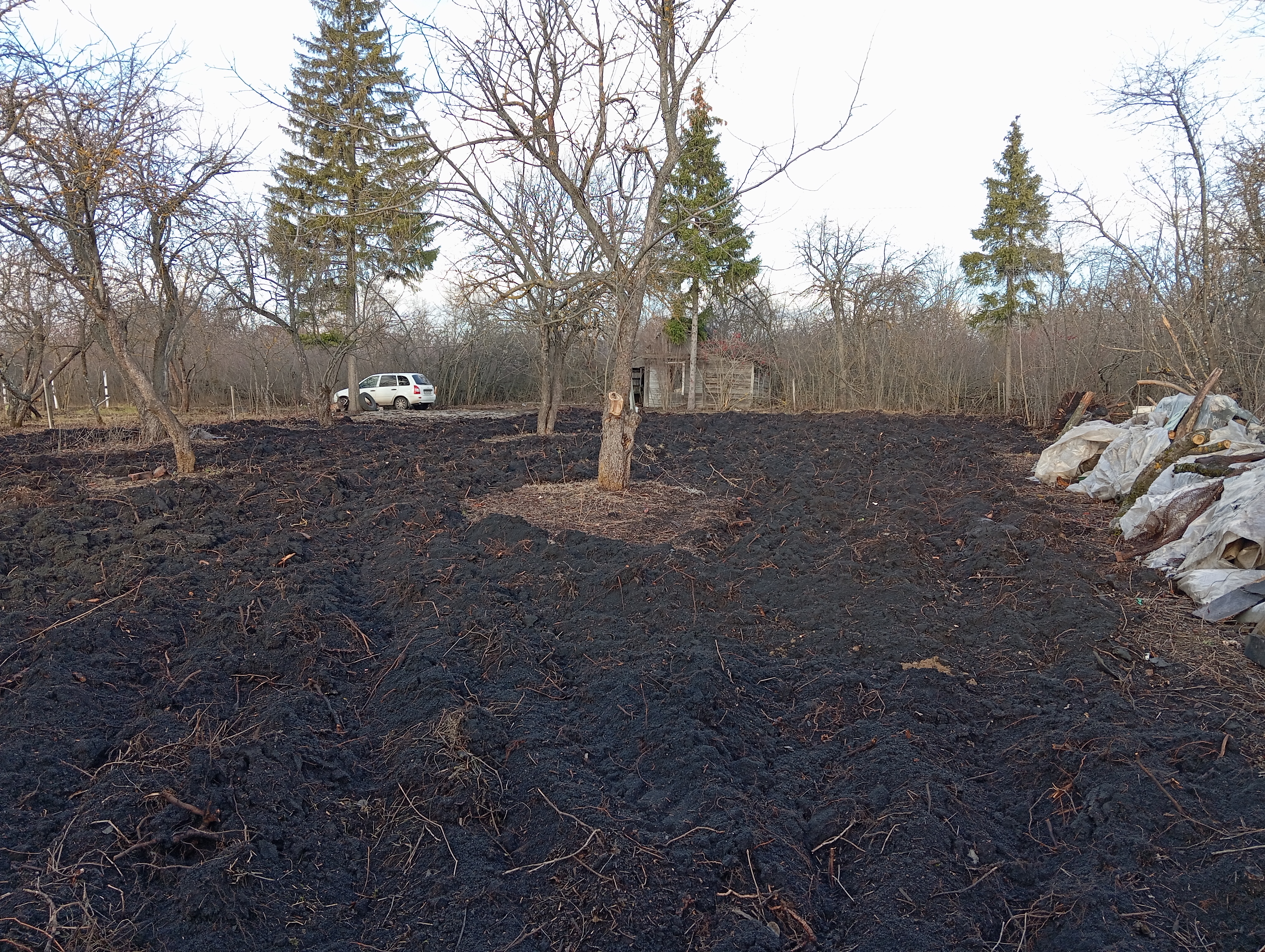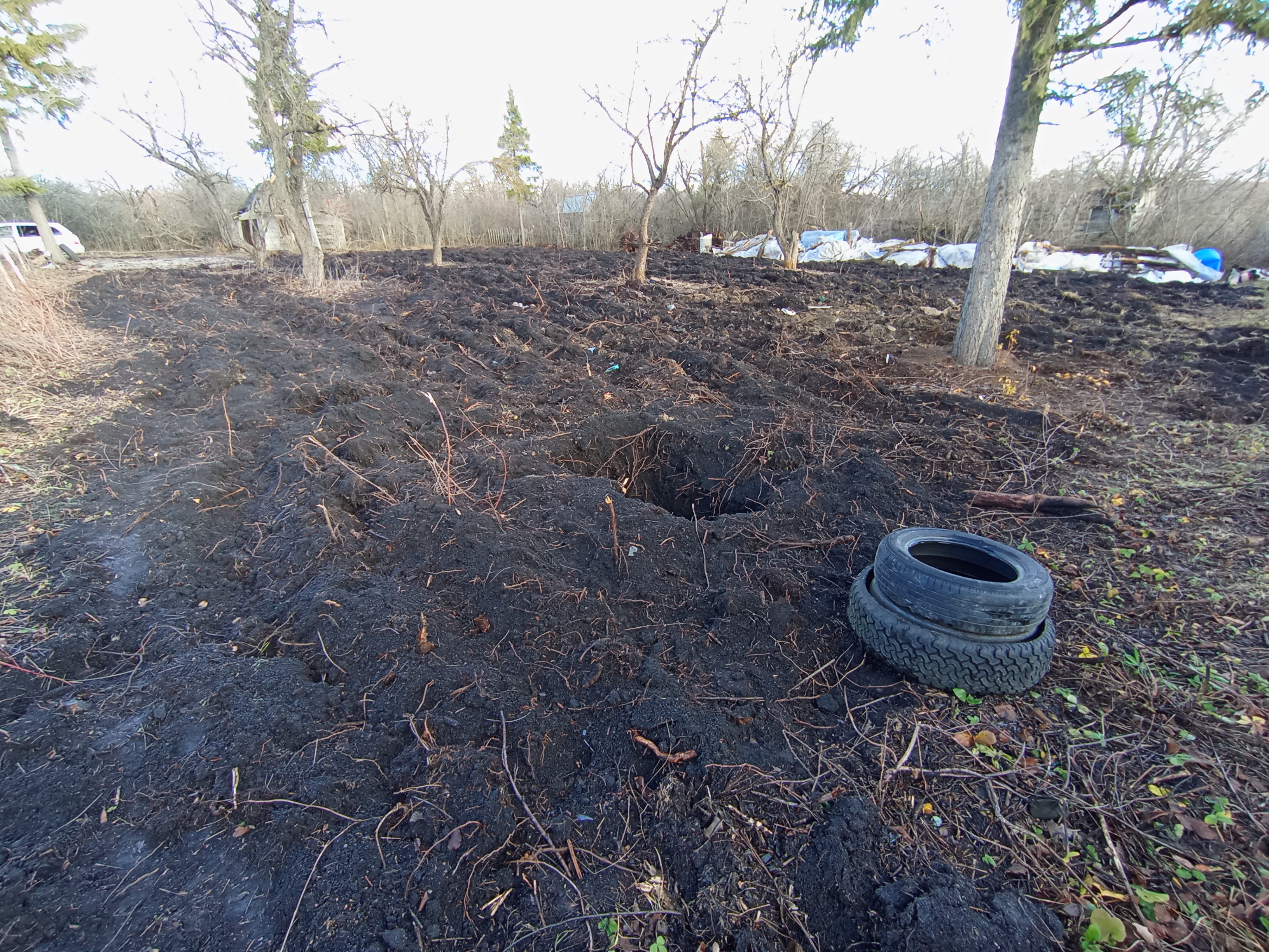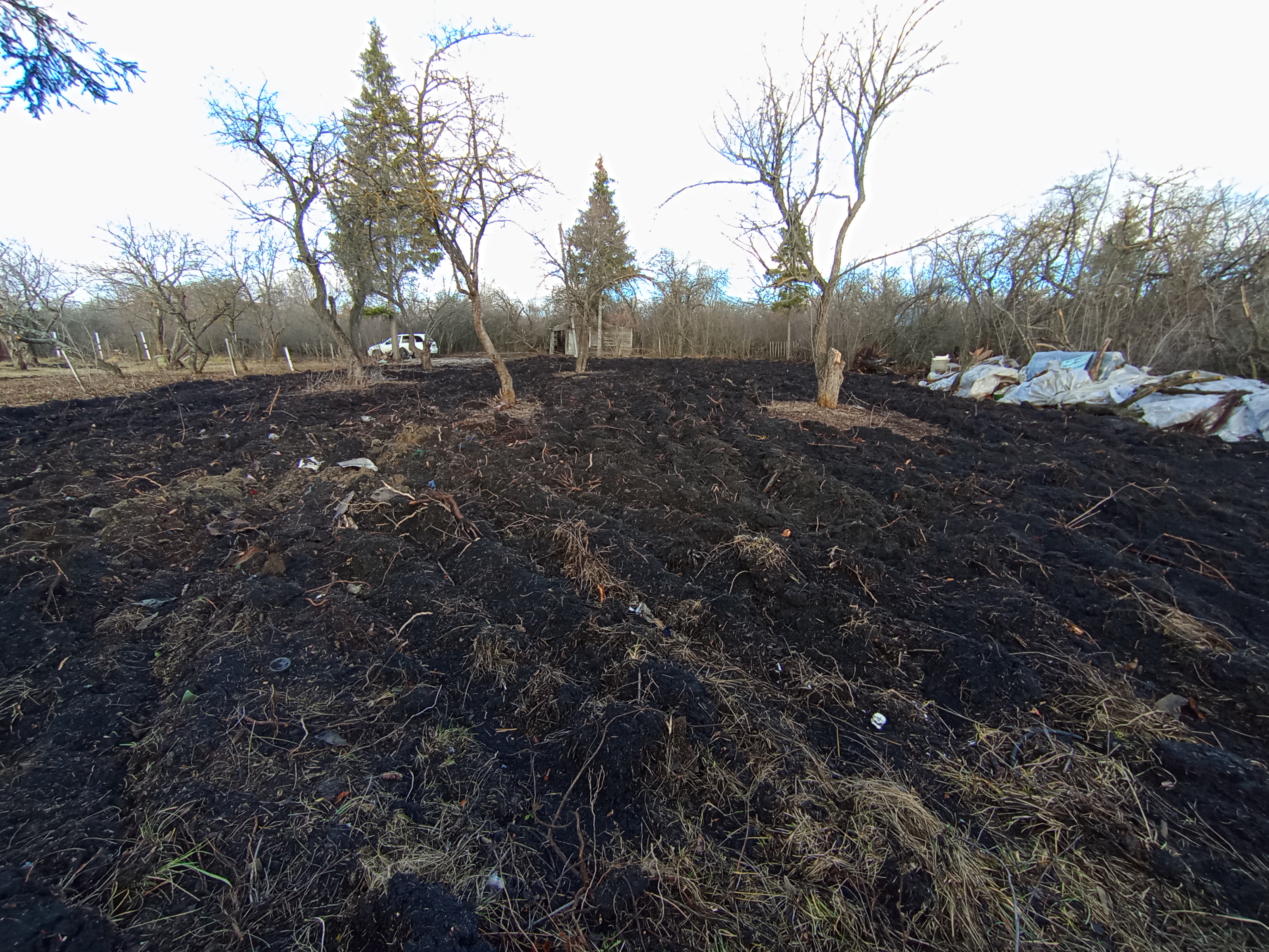 Домик был 15 кв.м. (разобрали под сарай). Дачный участок не использовался лет 10, в этом году выкорчевали корни и вспахали. Отсыпано парковочое место, выкопана яма для туалета.