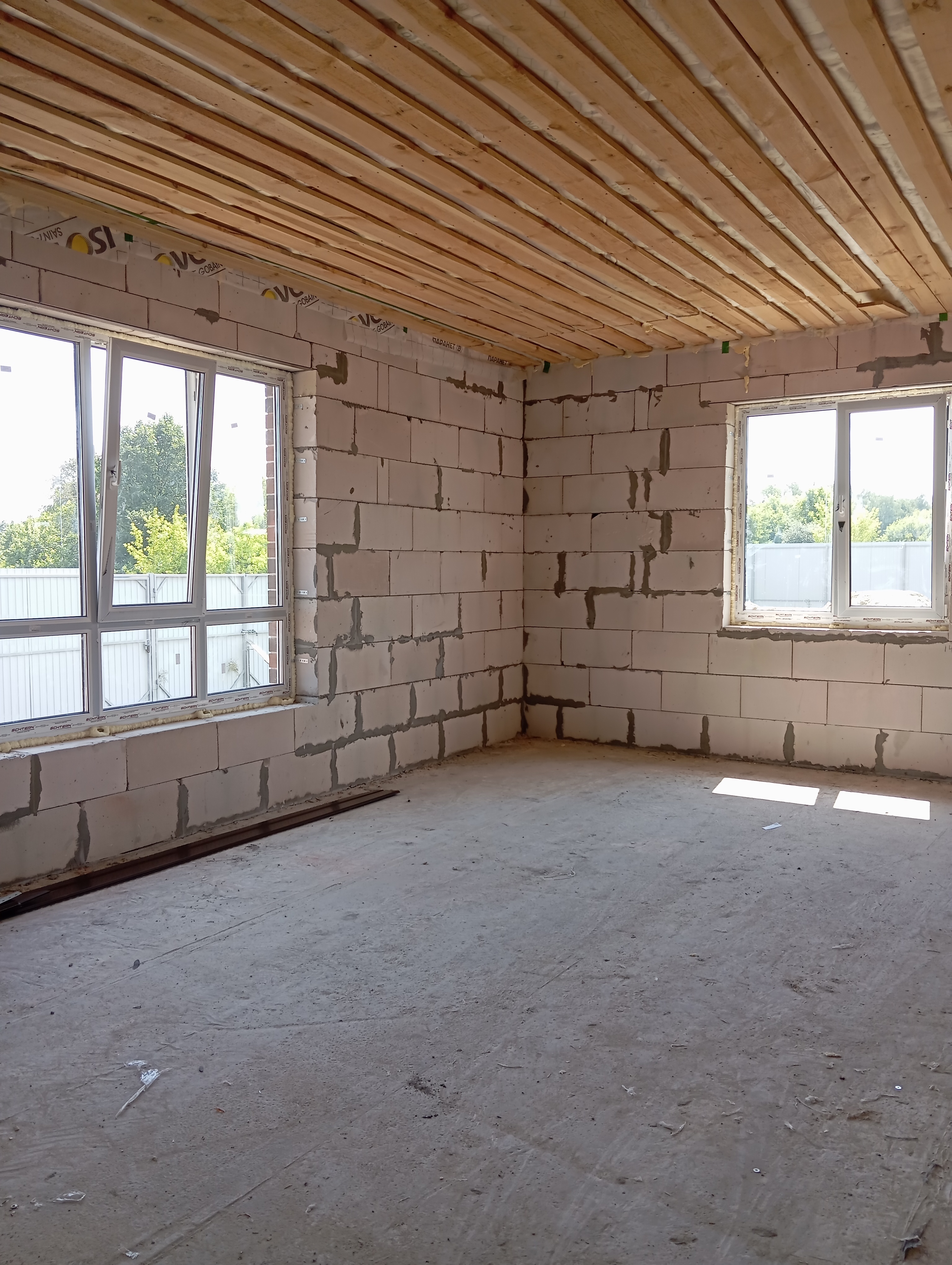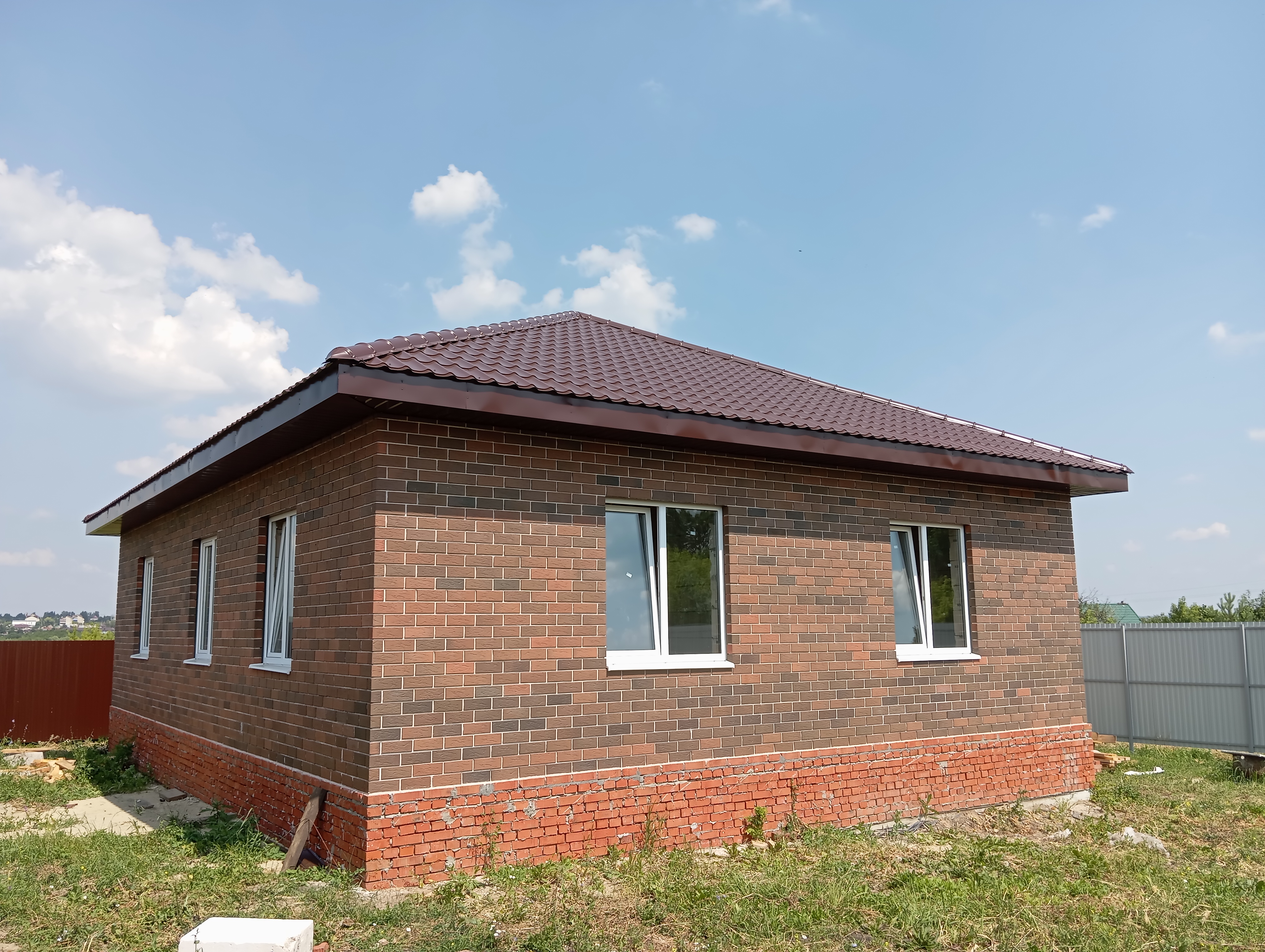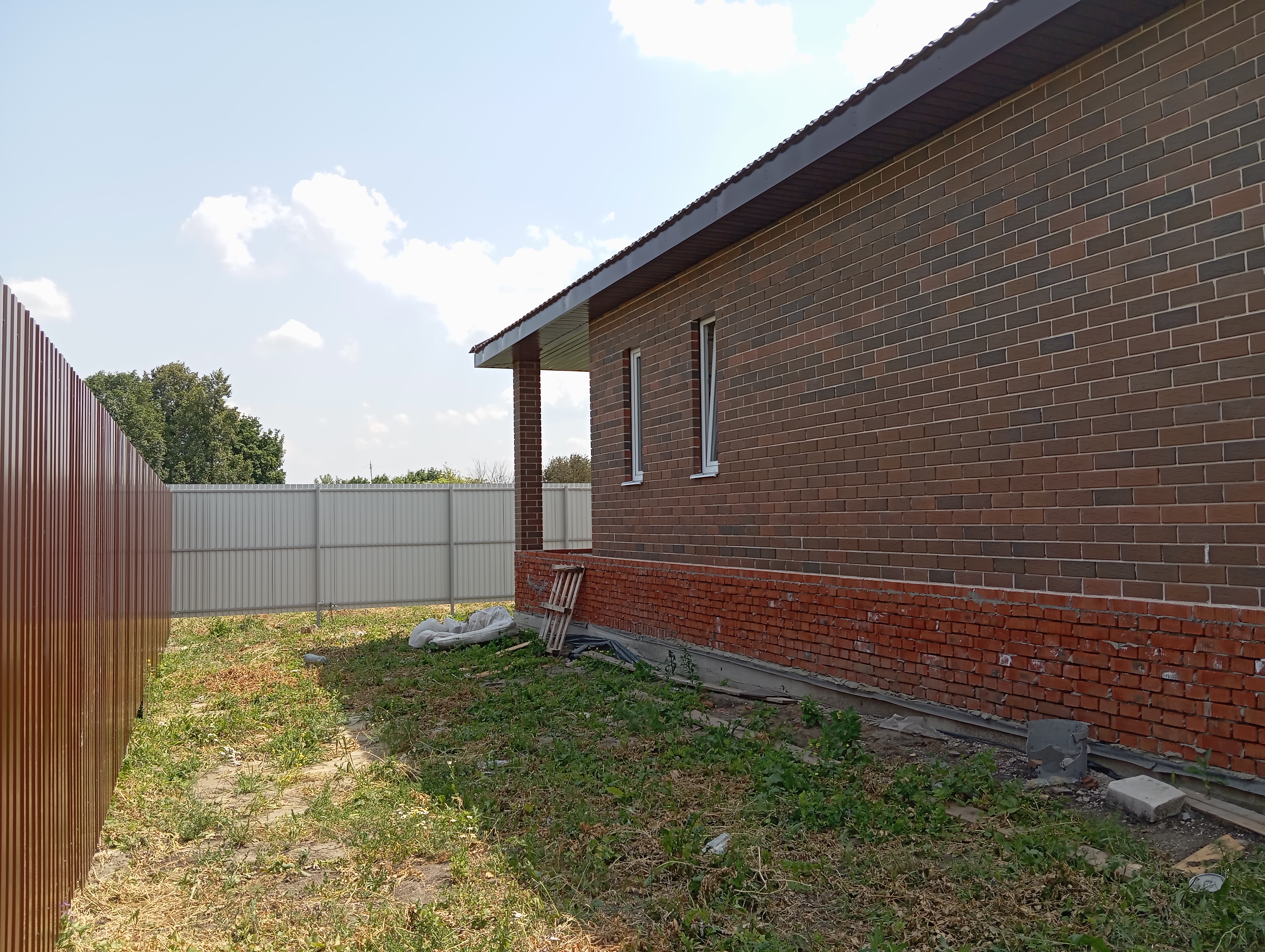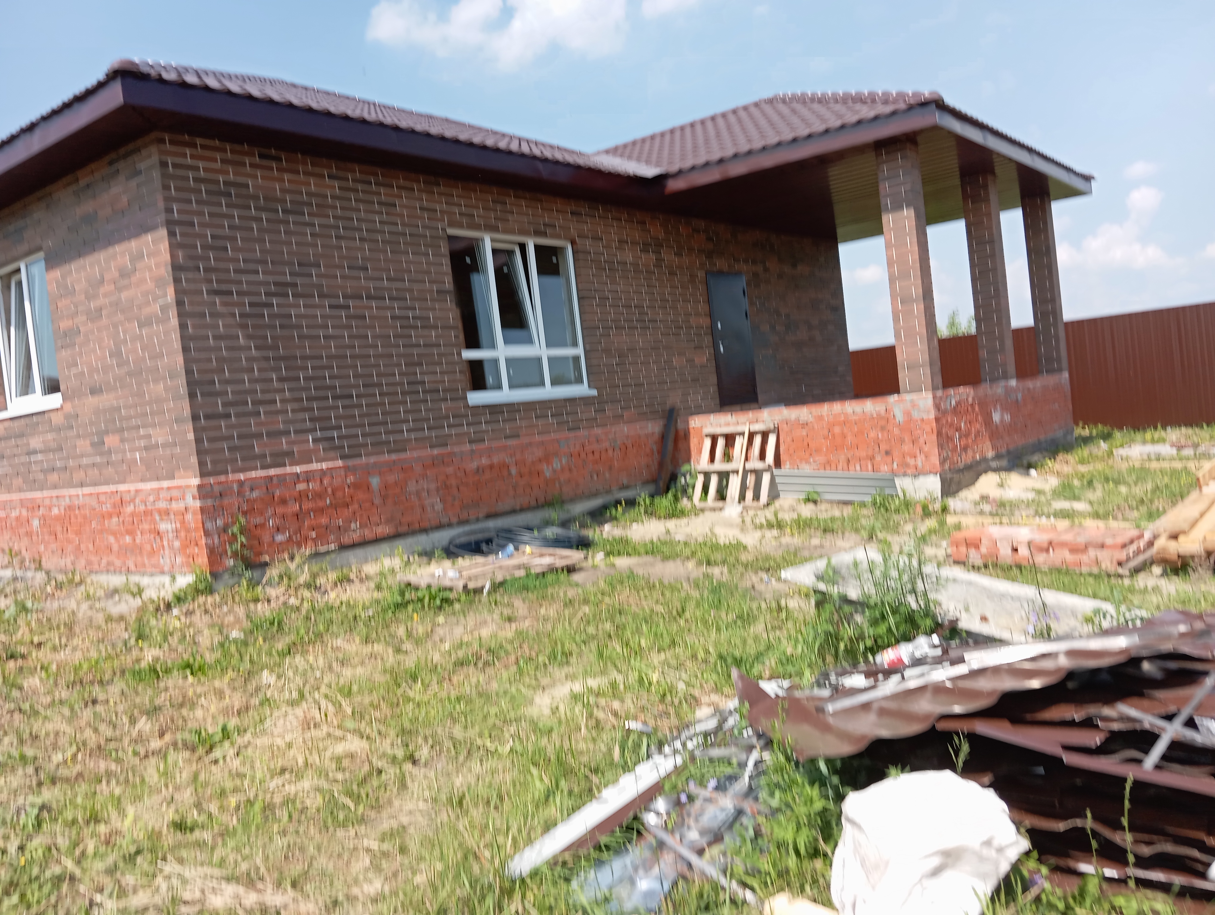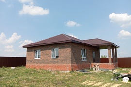 Черновая отделка: буронабивной фундамент с монолитным ростверком, материал стен пеноблок 250х300, фасад облицовочный кирпич. Полы засыпаны песком и залиты бетонной смесью. Установлены пластиковые окна 70 профиль, с двойным стеклопакетом и отражающей пленкой. Крыша перекрыта металлочерепицей, дышащий материал, утеплена, входная металлическая дверь с теромразрывом. По всему периметру установлен забор, с воротами и входной дверью. Продается в таком варианте, кака на представлено на фото.