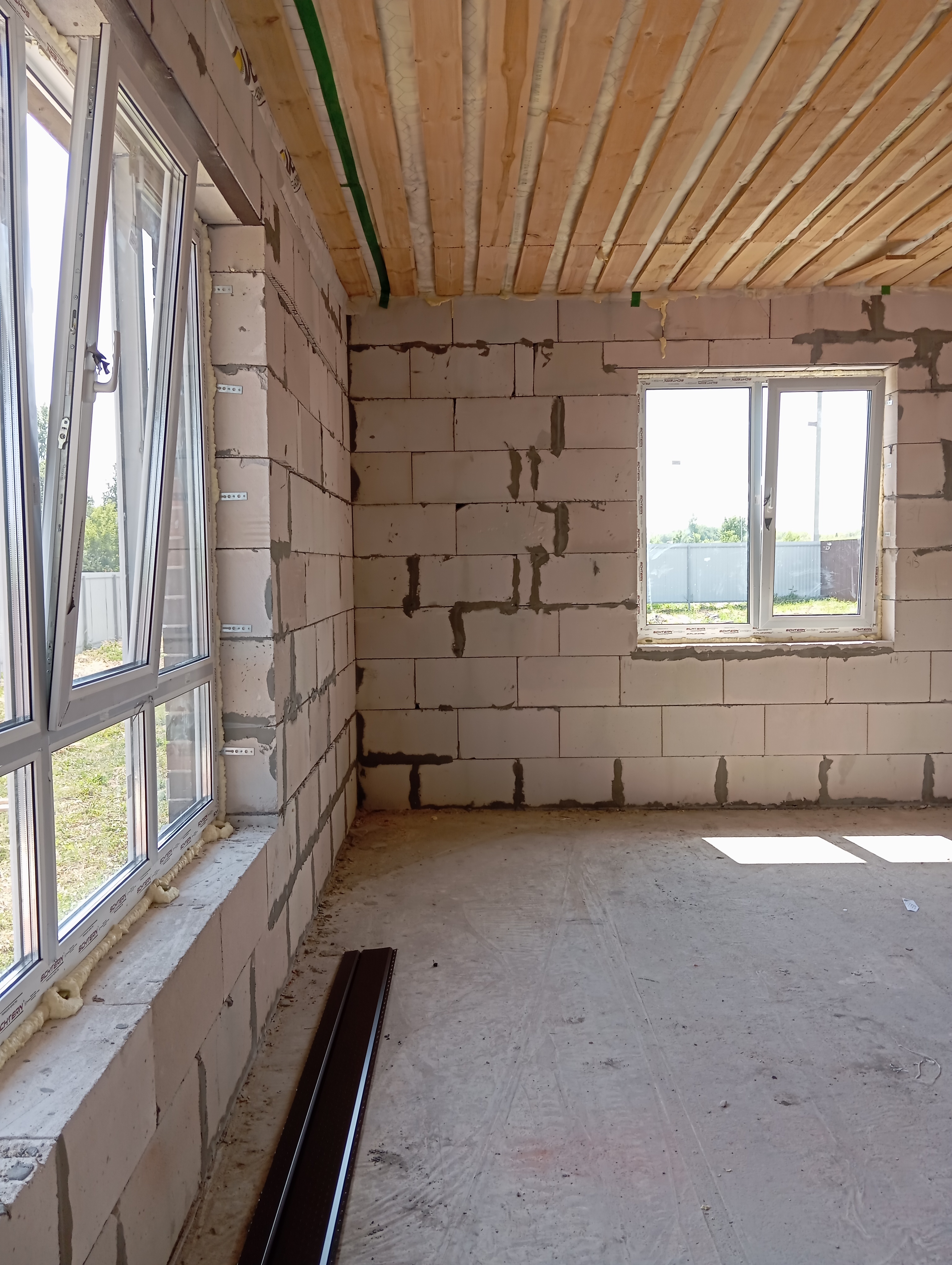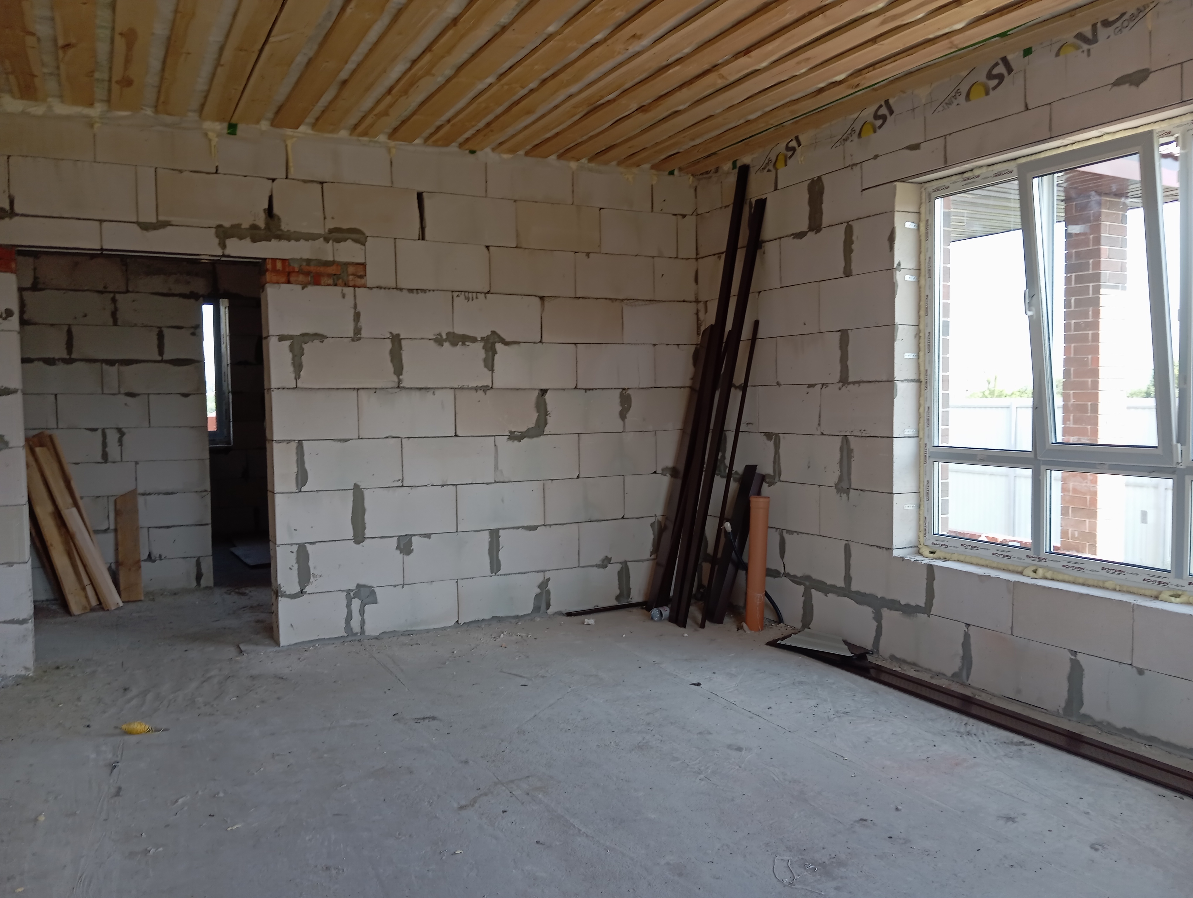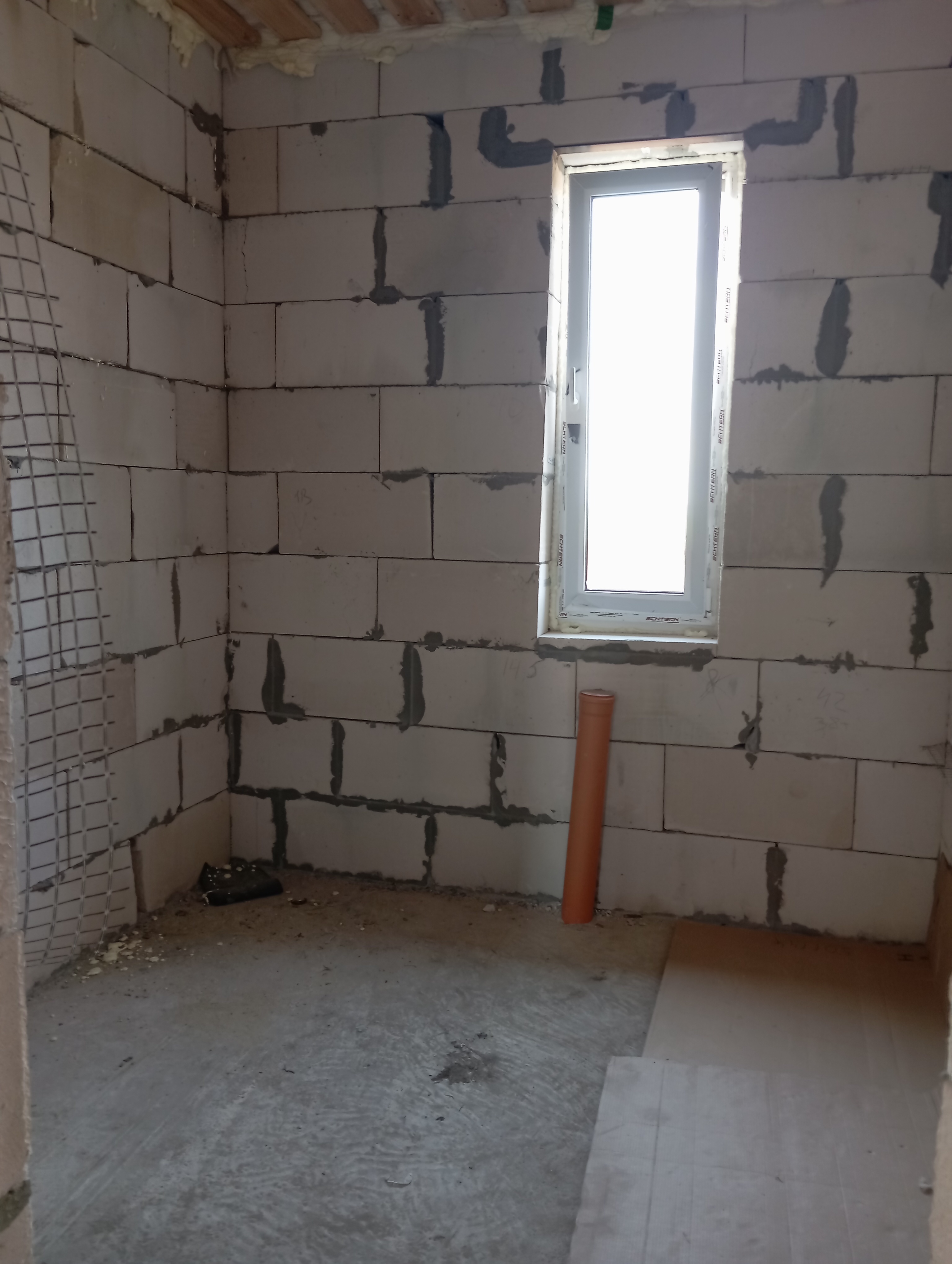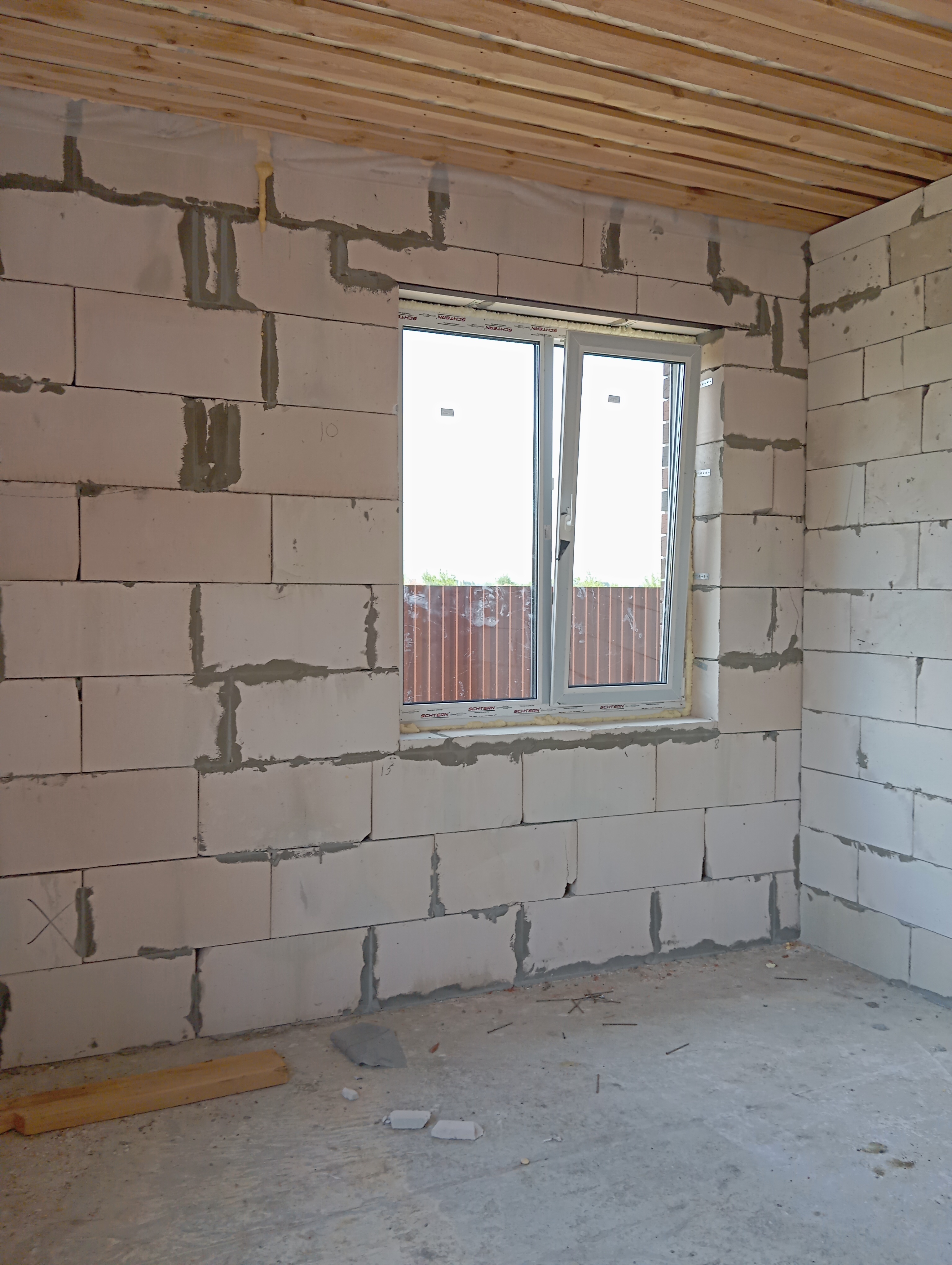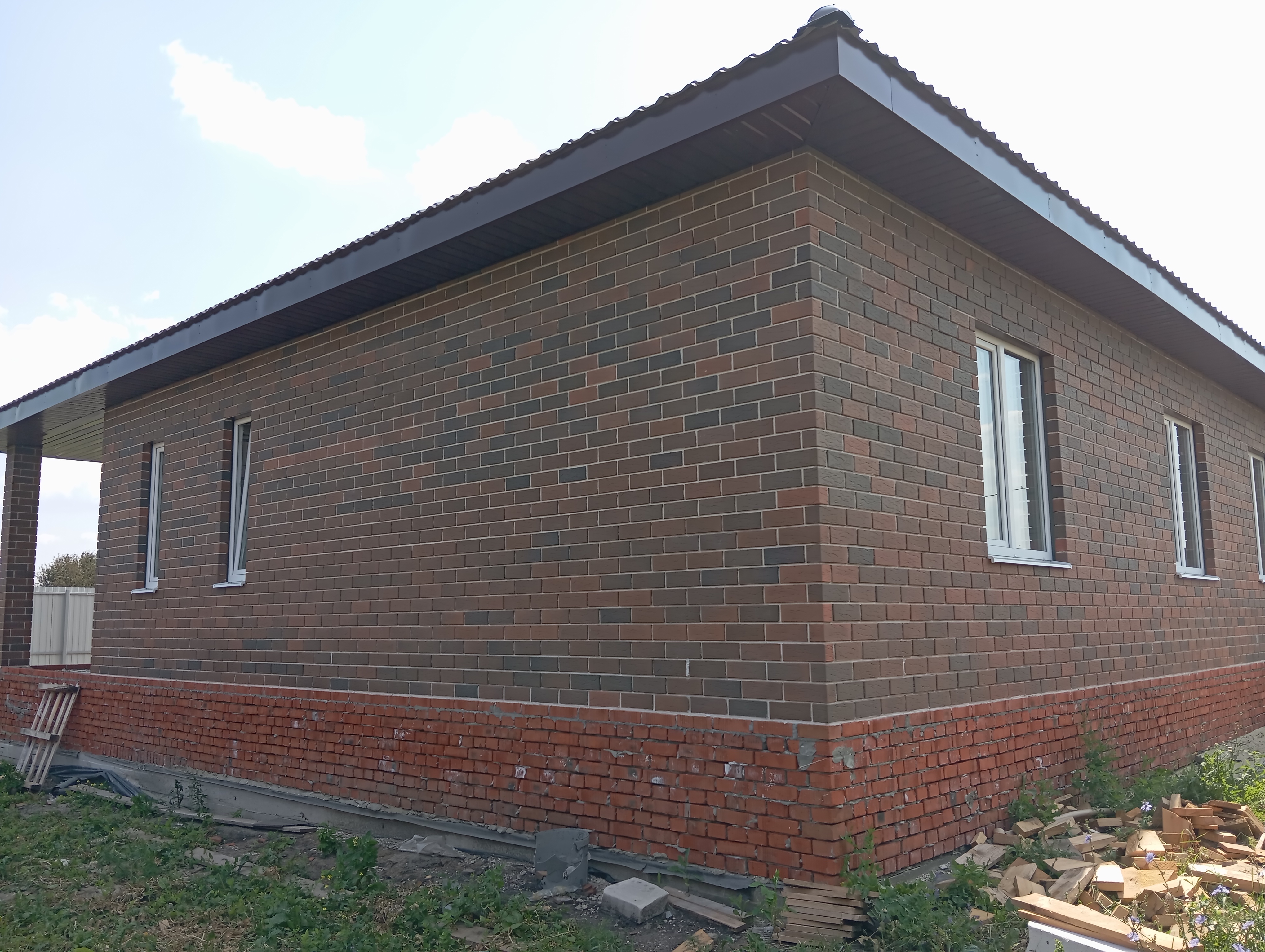 Черновая отделка: буронабивной фундамент с монолитным ростверком, материал стен пеноблок 250х300, фасад облицовочный кирпич. Полы засыпаны песком и залиты бетонной смесью. Установлены пластиковые окна 70 профиль, с двойным стеклопакетом и отражающей пленкой. Крыша перекрыта металлочерепицей, дышащий материал, утеплена, входная металлическая дверь с теромразрывом. По всему периметру установлен забор, с воротами и входной дверью. Продается в таком варианте, кака на представлено на фото.
