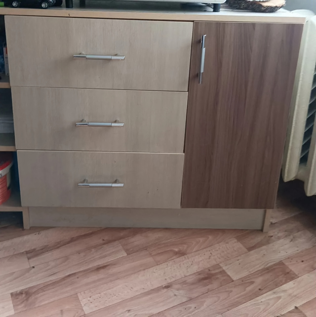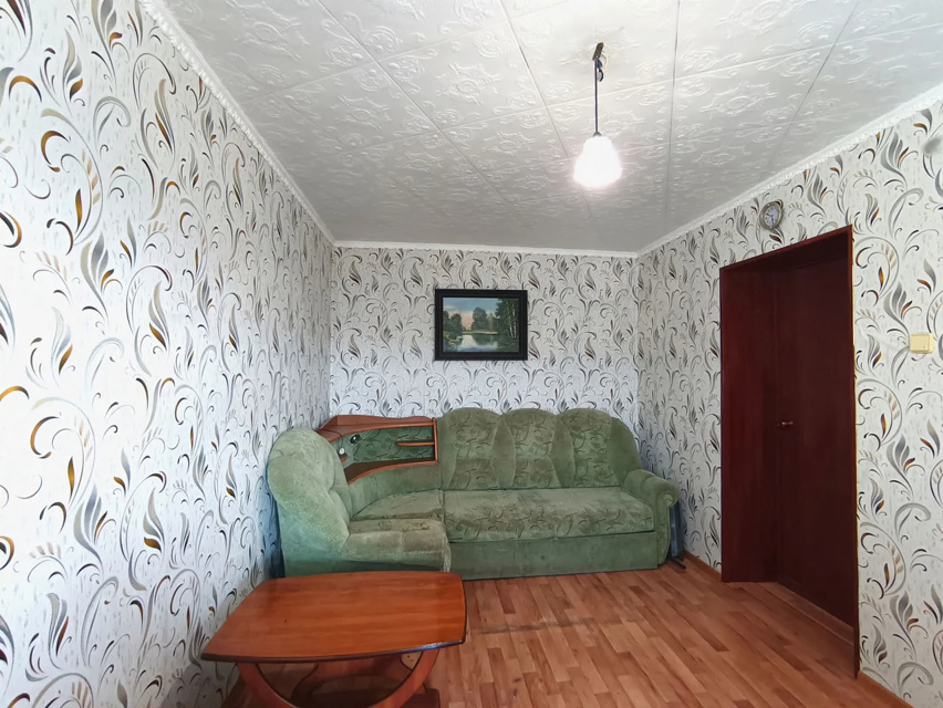 Новому собственнику остаётся мебель: диван, журнальный столик, комод, кухонный уголок (угловой диван и стол), кухонные шкафы напольные и навесные.