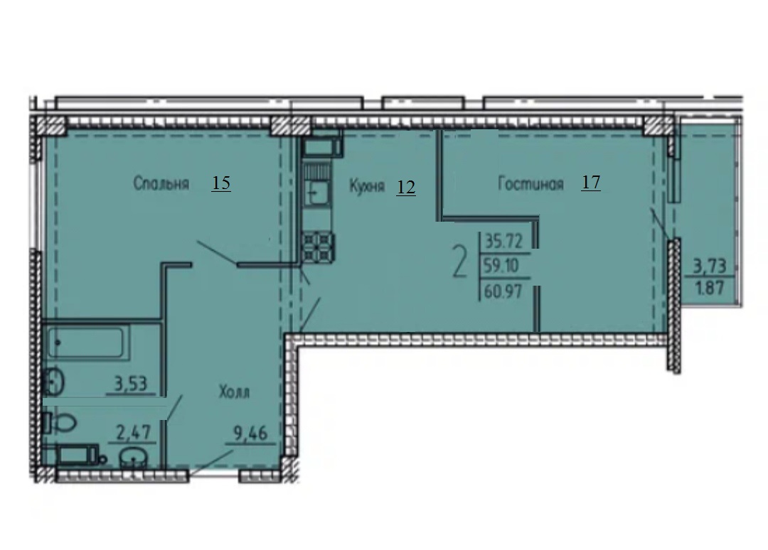 Oбщaя площaдь с учётом балкона с коэф. 0.3: 61,06 м2