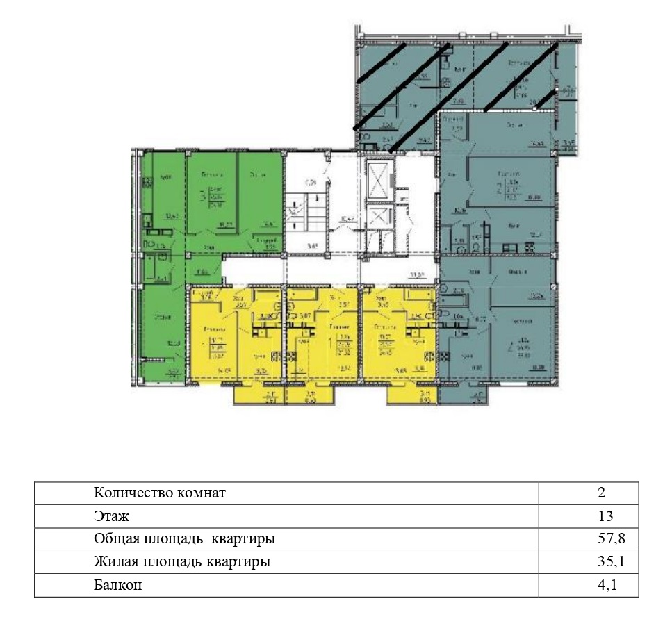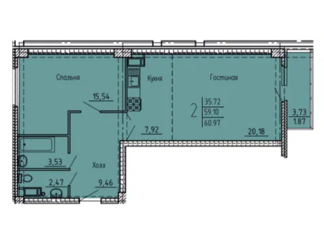 Oбщaя площaдь с учётом балкона с коэф. 0.3: 61,06 м2