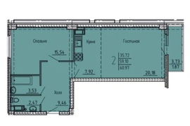 Жилaя площaдь: 35,8 м2 (15,59 + 20,21). Кухня 8 м2.