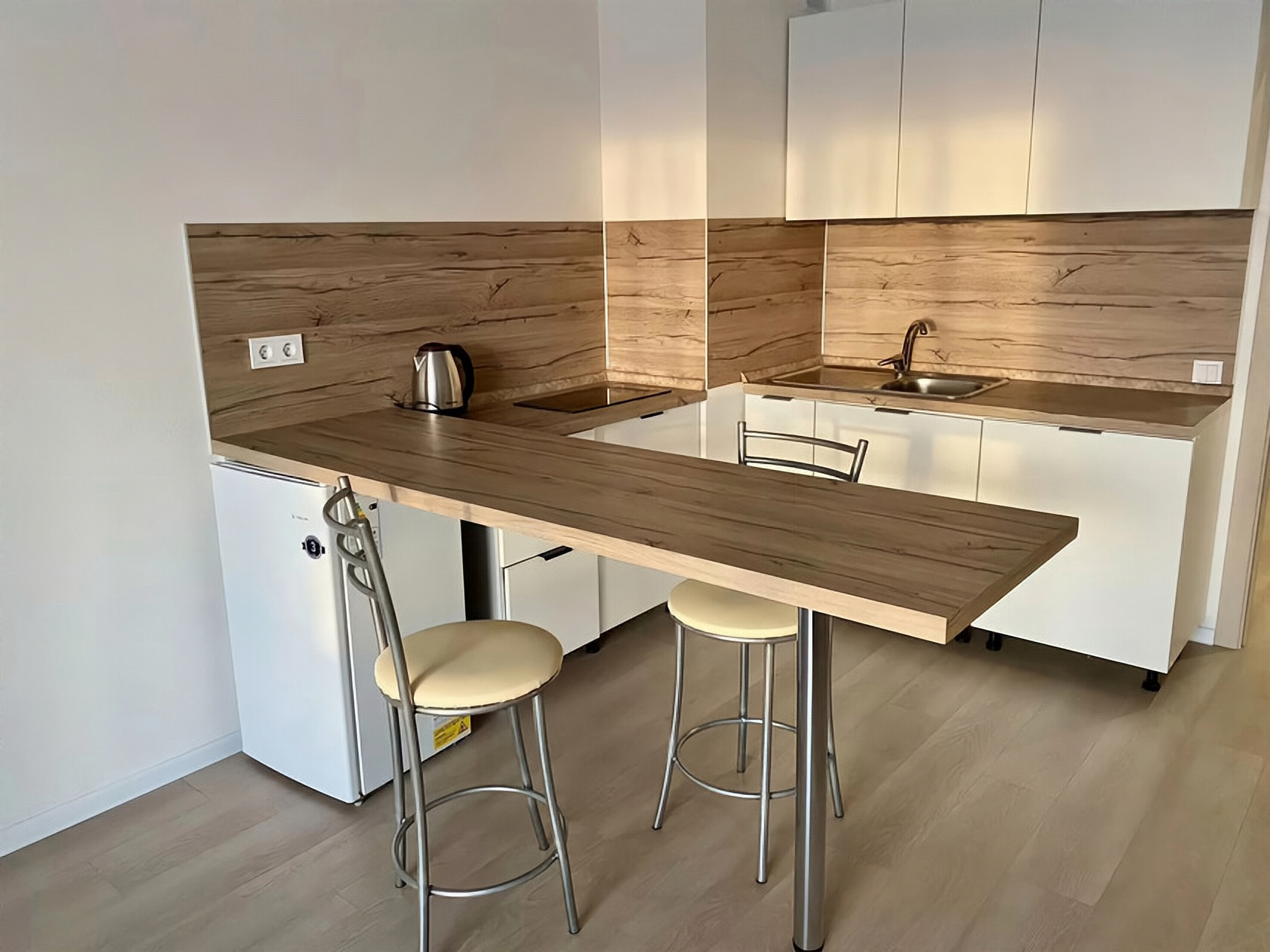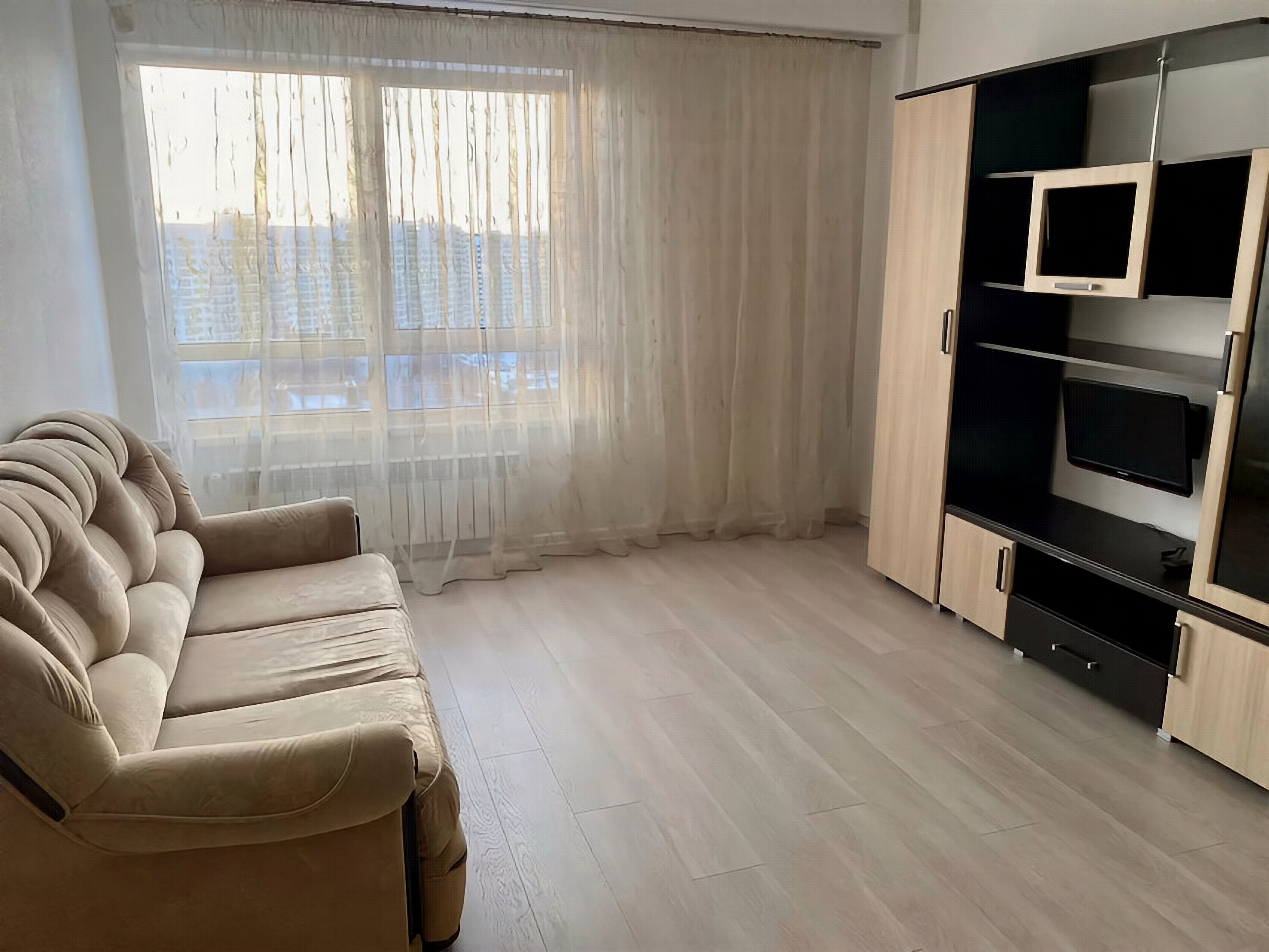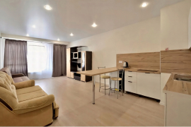 В студии выполнен качественный ремонт: входная металлическая дверь, установлены межкомнатные двери, обои под покраску, ламинат 33 класса, натяжные потолки с точечным освещением, санузел в плитке.