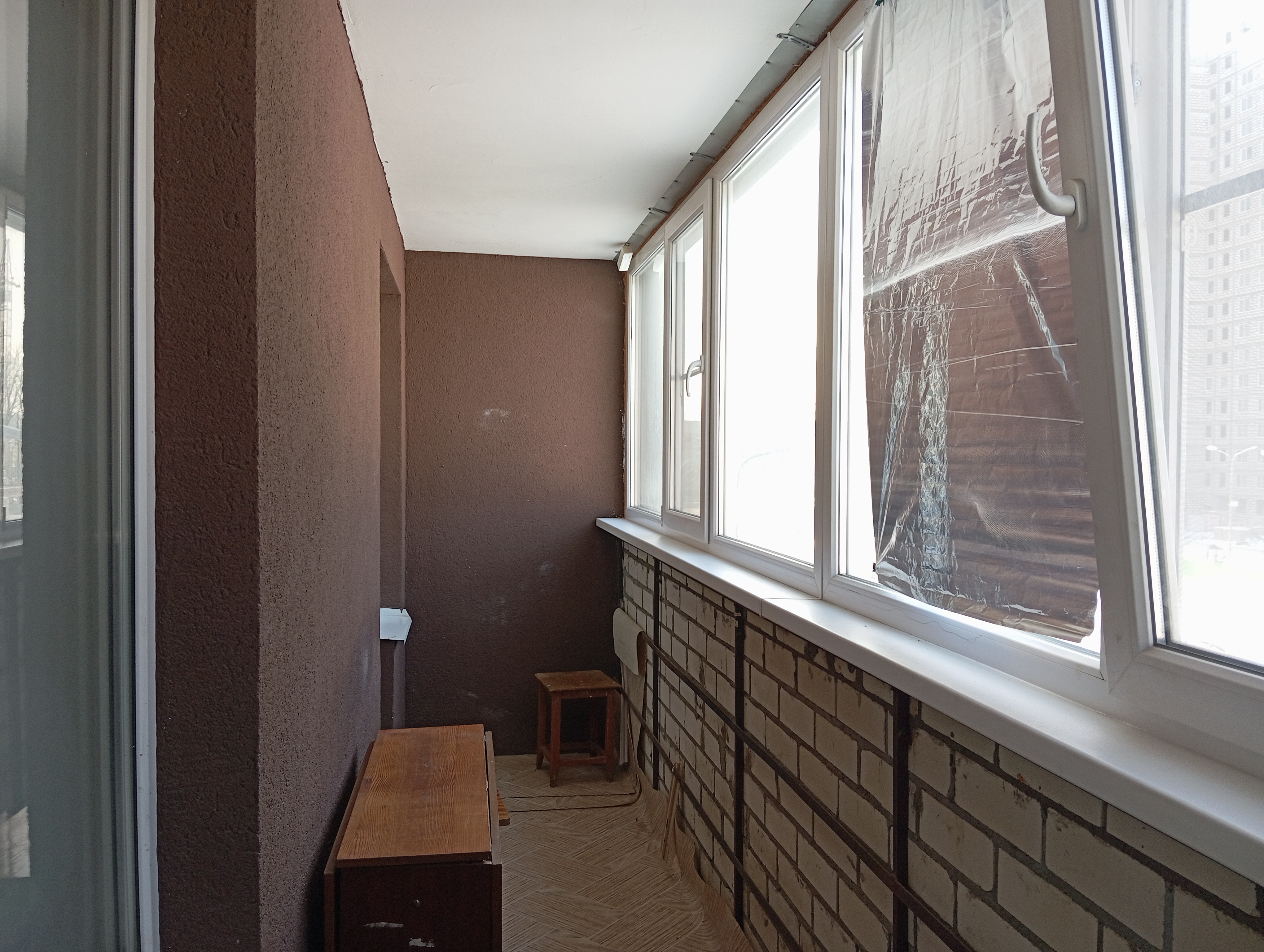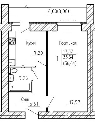 Гостиная 17,6 кв.м., кухня 7.2 кв.м., коридор 5.6 кв.м., с/у 3.3 кв.м., лоджия 6 кв.м. (кирпичная кладка, застеклена!)
