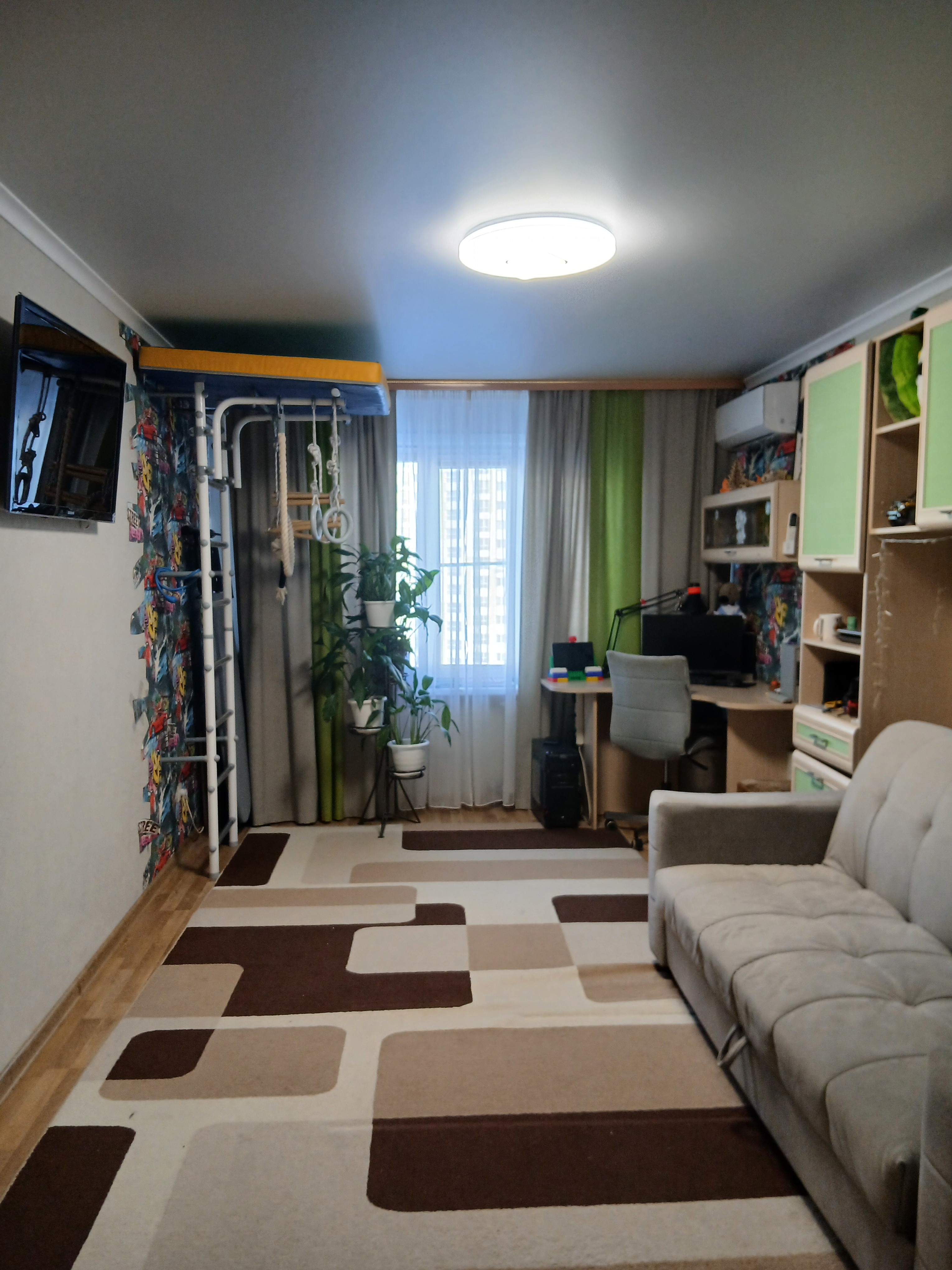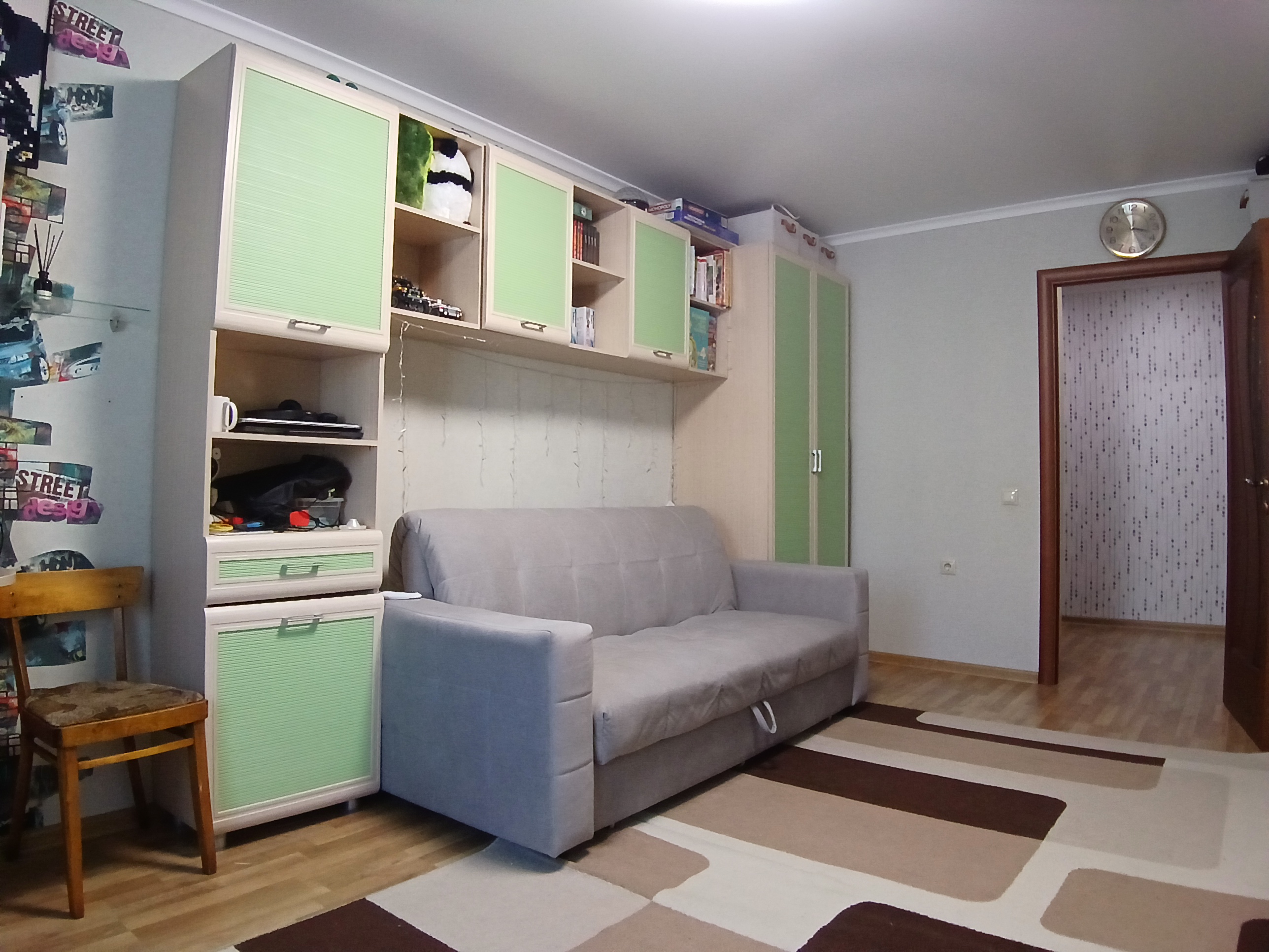 Большая, хорошая, светлая, просторная планировка, имеет форму распашонки. Два окна выходят на восток и одно окно на запад.